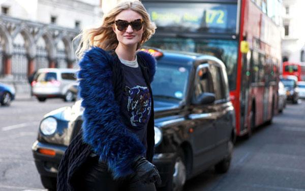 London-based photographer, blogger and former model, Candice Lake, looks amazing in Karen Walker Number One sunnies, Rue du Mail jacket with its feathery blue wings teamed with her Topshop top.