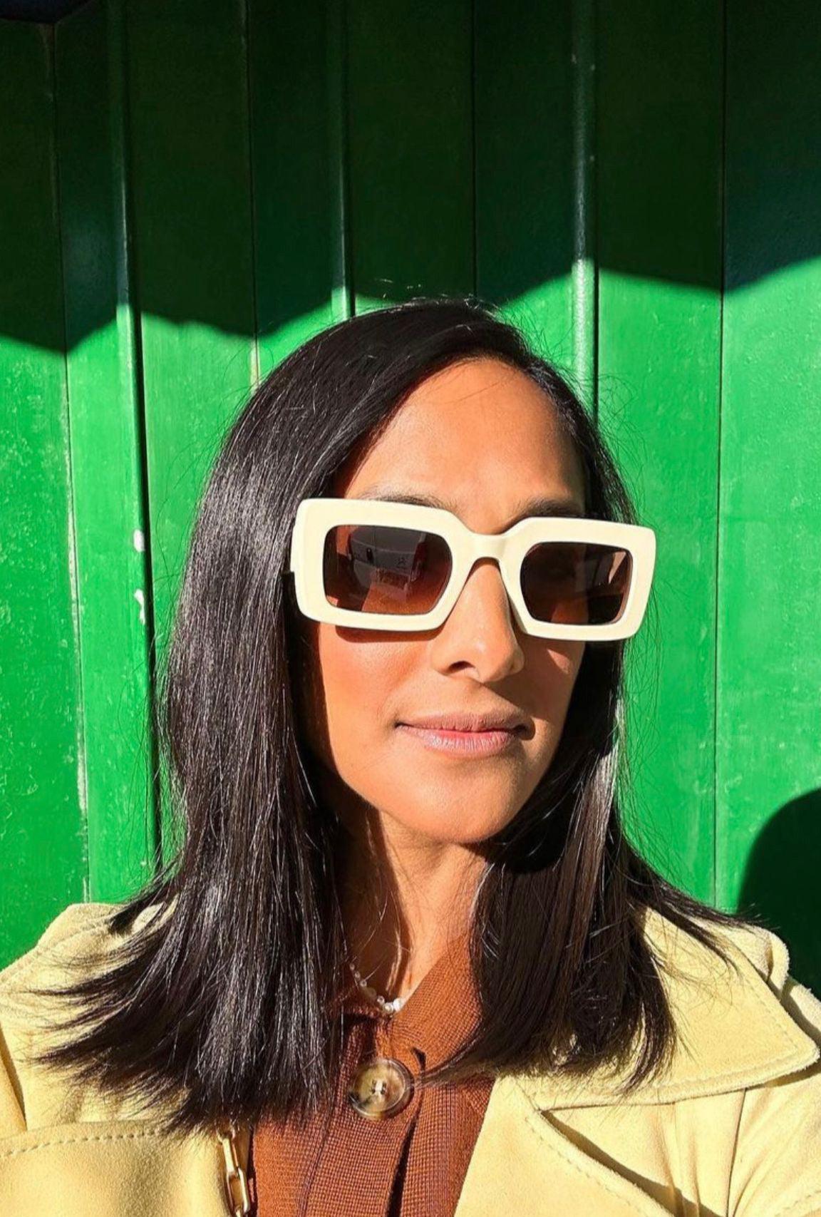 Art Director, stylist, author and presenter, Zeena Shah spotted wearing a pair pf Kaleos Zajac rectangular sunglasses.