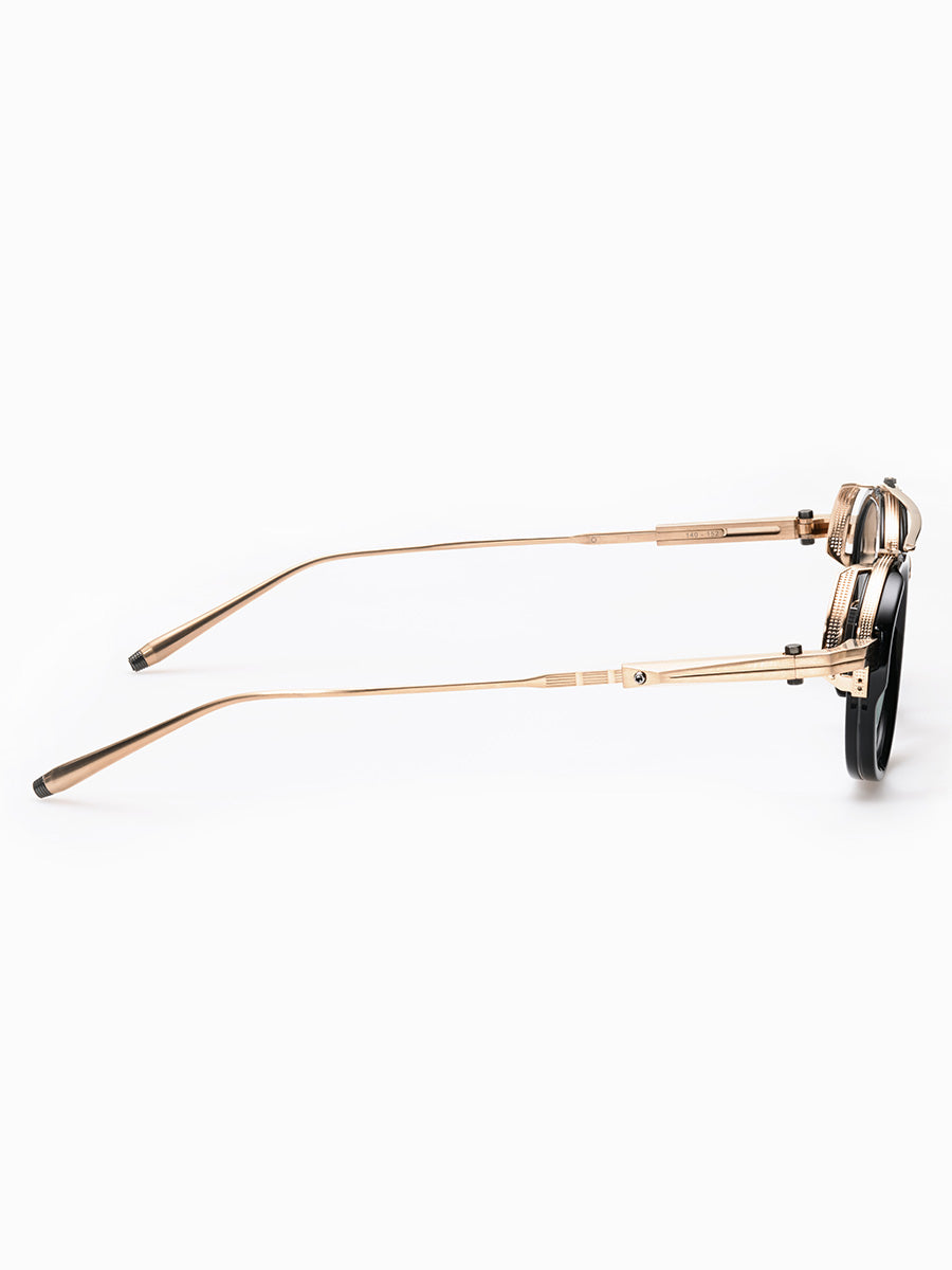 AKONI Infinity Brushed 12K Gold 512A sunglasses featuring a bold acetate front combined with a half-eye rim in titanium and half acetate.
