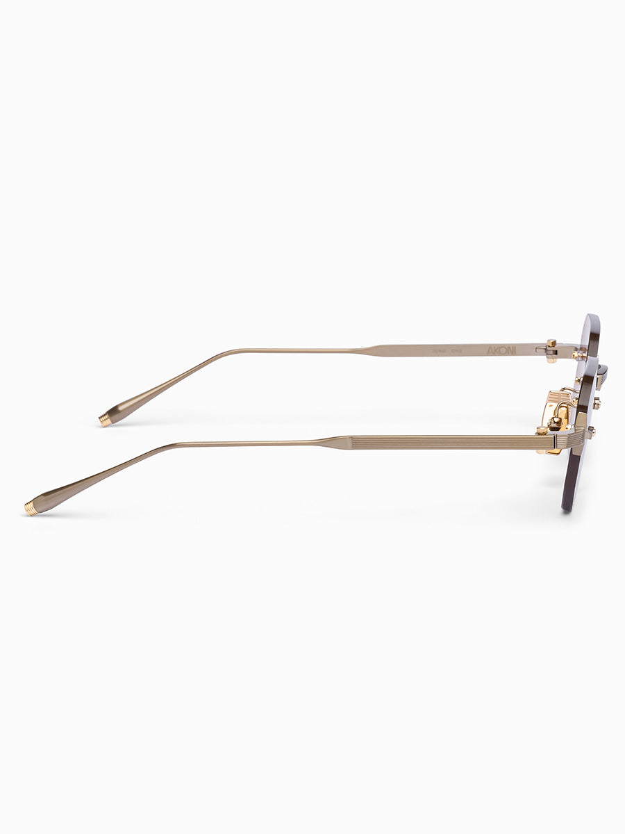 AKONI Juno One Antiqued 12K Gold 308B sunglasses, featuring a rimless design that relies on the featherlight, yet powerful Japanese titanium frames fitted with temples adorned with AKONI's knurling piece and capped with a branded temple tips.