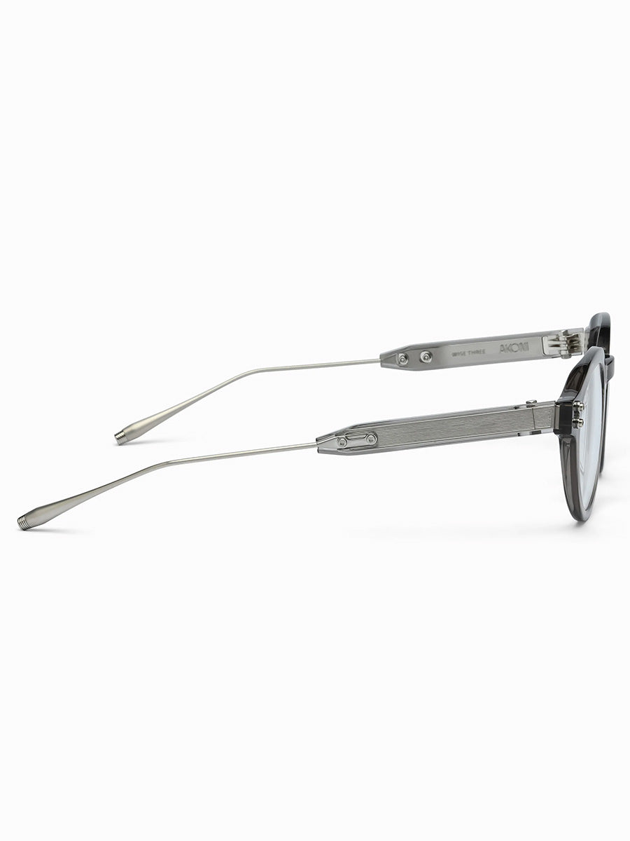 AKONI Wise Three Crystal Dark Grey 520B eyeglasses featuring panto-shaped frames made from lightweight acetate, with a titanium flat bar on the temples.