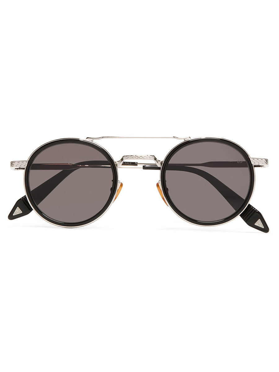 BREITLING x Cutler and Gross 0002 Chrono Black sunglasses featuring round frames connected by an extended double nose bridge with engraved Milanese detailing, a motif drawn from BREITLING's original watch straps.