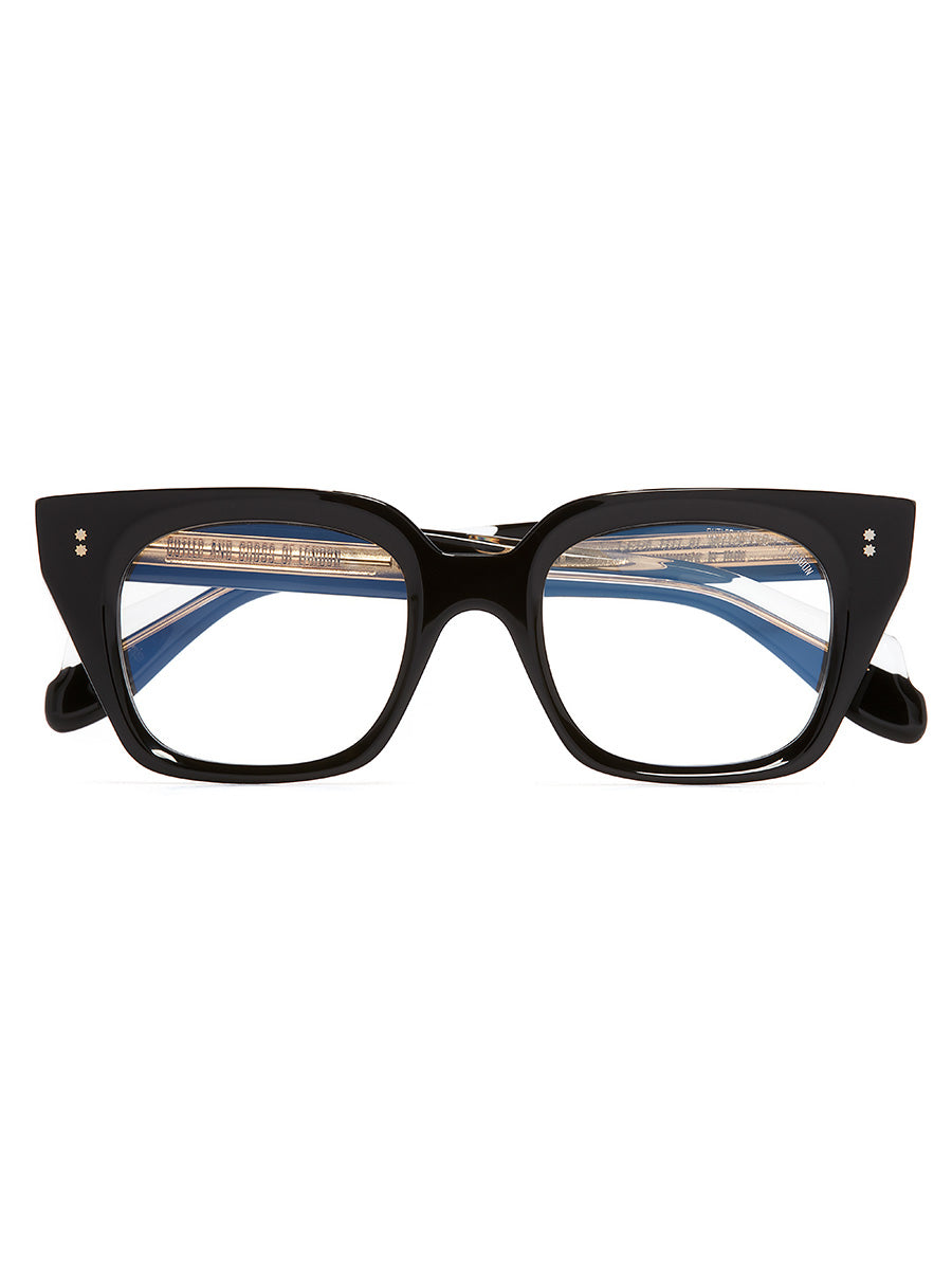 Cutler and Gross CGOP 1411 01 Black eyeglasses feature square, angular frames inspired by '60s cinema. With a straight browbar, slanted lugs, and chamfered edges threaded with Modernist core wire, they hint at a subtle, genderless cat-eye design.