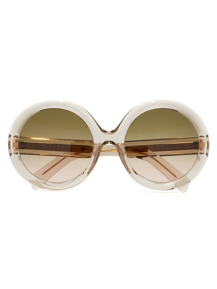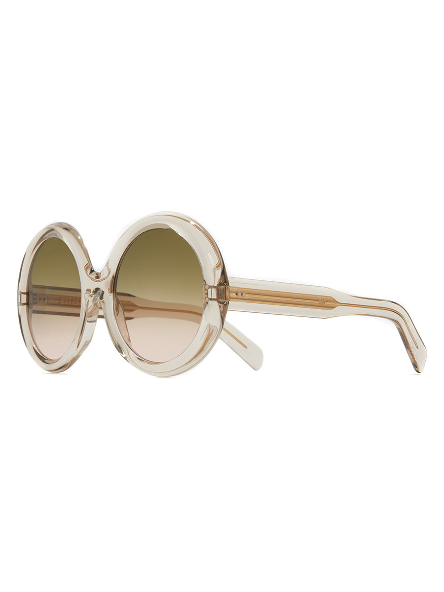 Cutler and Gross CGSN 1412 03 Sand Crystal sunglasses featuring round oversized frames inspired by the brand's design archive from the '70s. The glasses have milling that enables the rivets to hug the lenses.