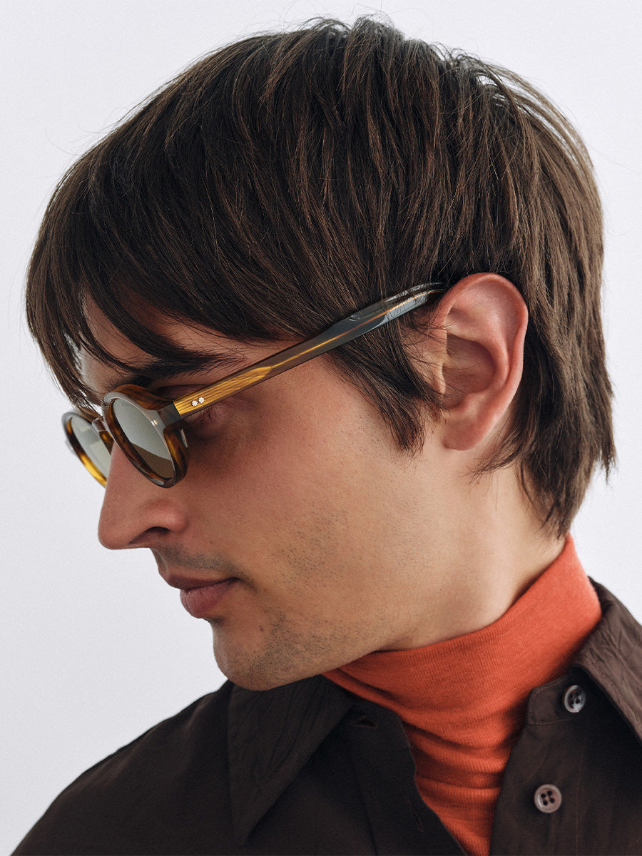 Cutler and Gross CGSN GR13 02 Mustard Horn sunglasses featuring oval frames crafted from 8mm milled acetate for comfort.