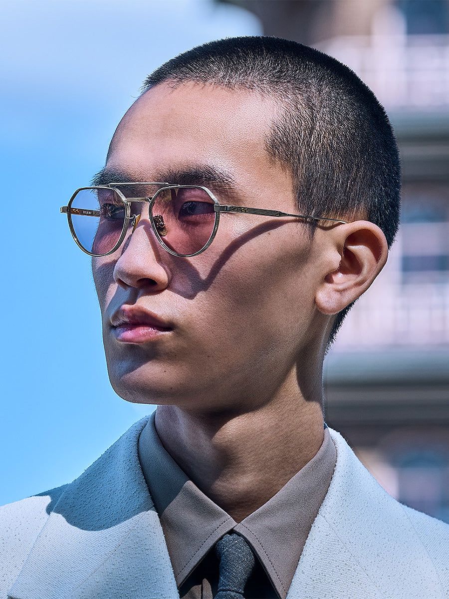 Cutler and Gross Draycott Silver Gold sunglasses featuring Titanium aviator frames with double nose bridge. The rounded silhouette is handcrafted in Sabae, Japan by master artisans who translate the signature Oyster pin into each precise line and cut.