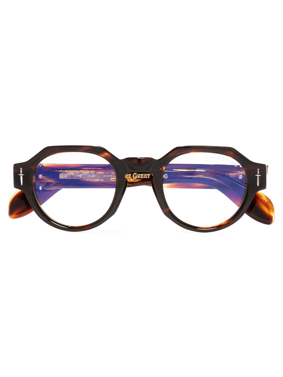 Cutler and Gross x The Great Frog Lucky Diamond Havana eyeglasses featuring round frames with a flat-top design and fitted with flat gradient lenses. Embellished with Sterling Silver Dagger frontal pins and Skull and Crossbones emblems at the temples.