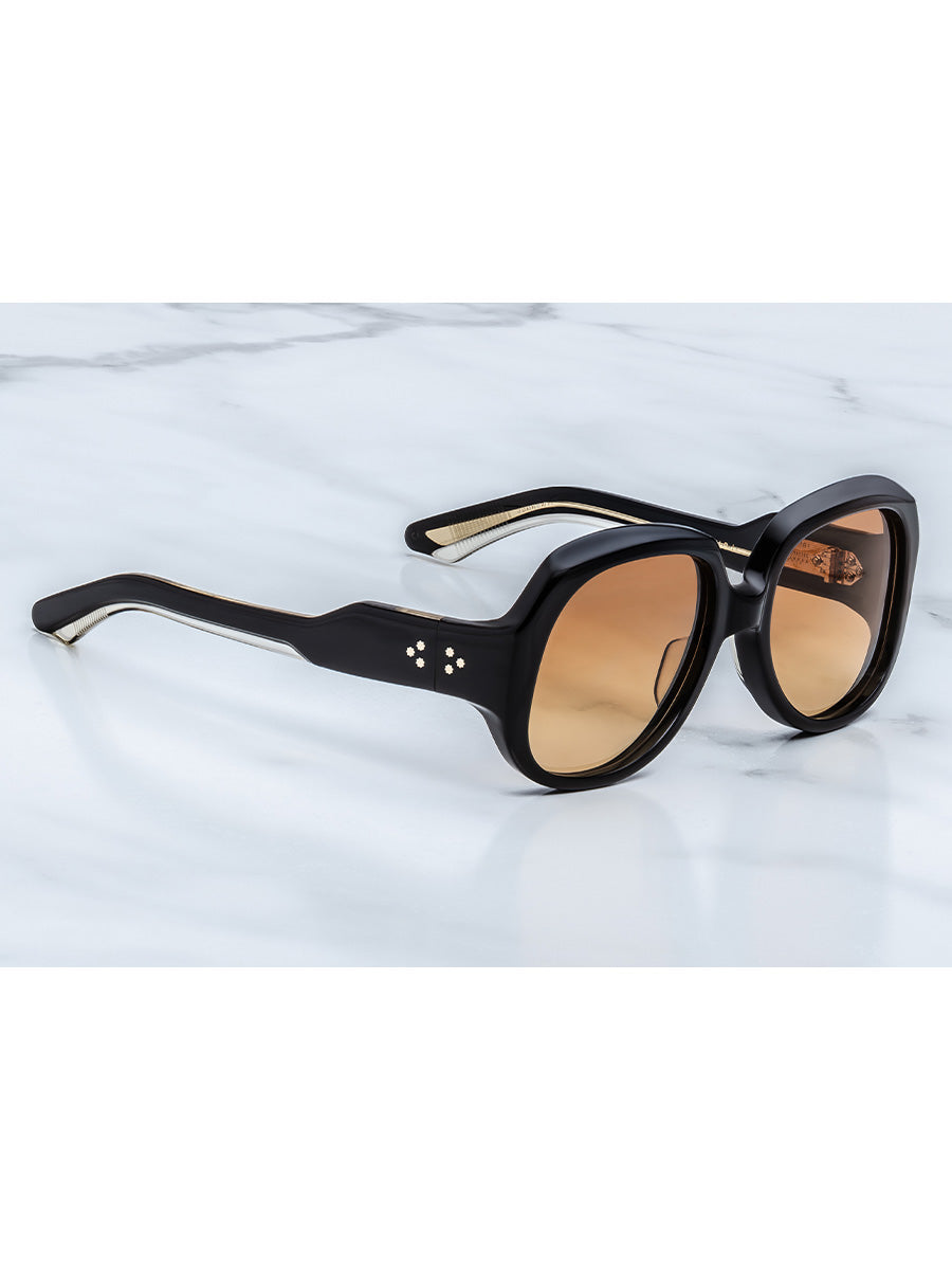 10mm cured cellulose acetate frame in polished black, with custom double-laminated temples composed of black exteriors and clear beige interiors.