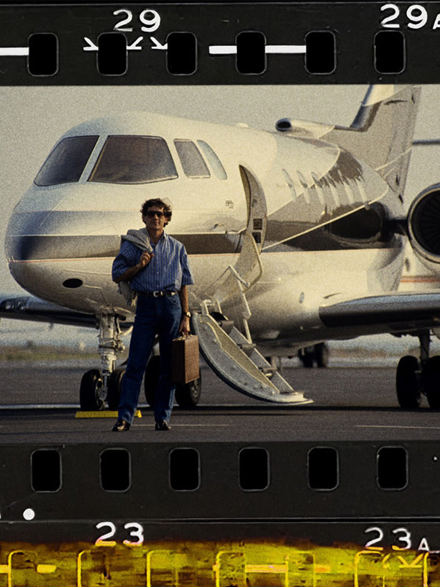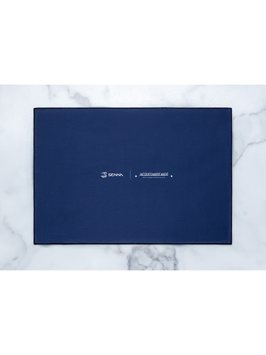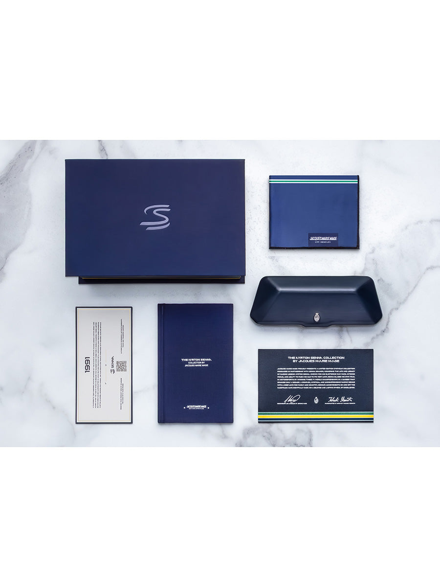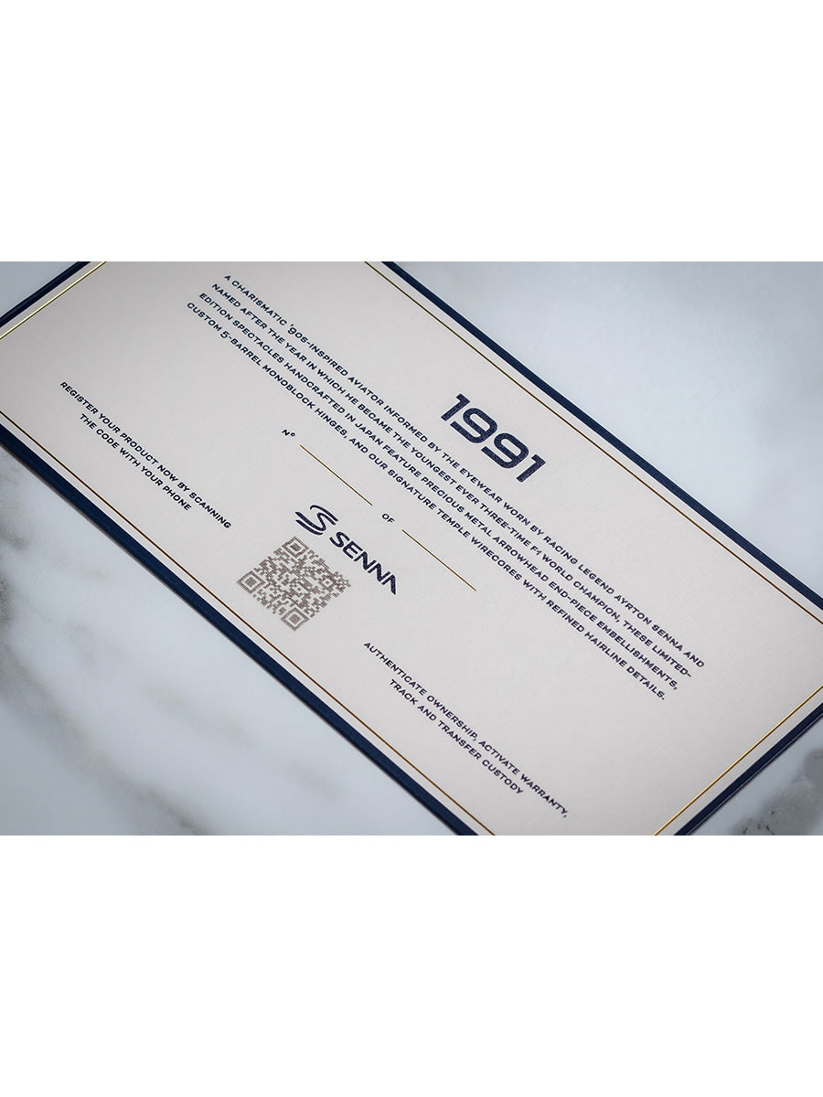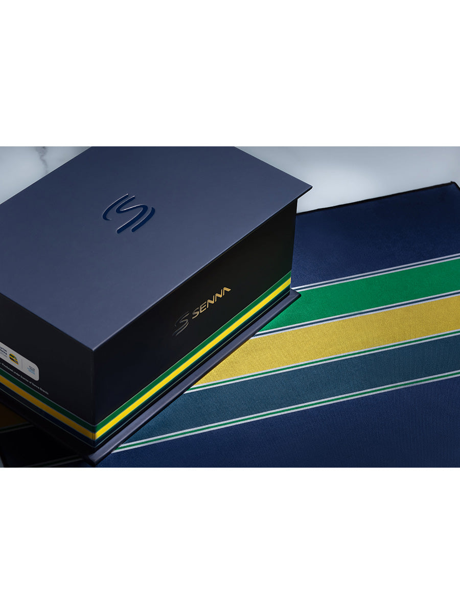 The limited-edition sunglasses come in a custom monograph box set in blue canvas featuring creative and colors inspired by Senna's iconic helmet design, and foil-stamped embellishments in white. Box includes a custom hardshell eyewear case and soft dust bag; commemorative cleaning cloth; a letterpress authenticity card with collection notes and handwritten limited-edition number, and an exclusive bi-lingual booklet (English/Portuguese) featuring photography and original commentary.