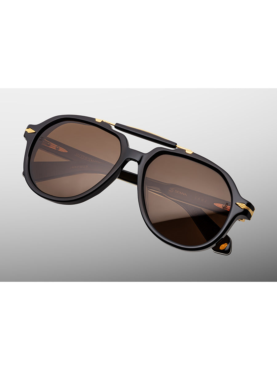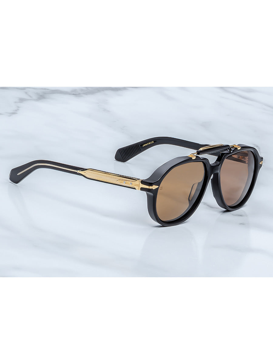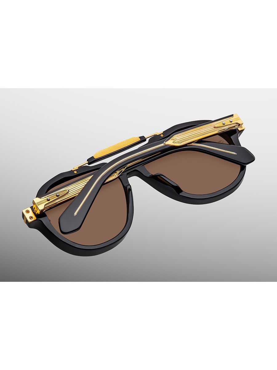 Jacques Marie Mage 1991 Eclipse 2 sunglasses featuring '90s-inspired aviator frames with custom acetate end-piece embellishments plated in 18K gold, exposed "Classic" wirecores with hairline-engraved art deco linework plated in 18K gold, custom arrowhead monoblock hinges with refined hairline details plated in 18K gold, signature spur-shaped rivet heads plated in silver palladium, inner temple hallmarks foil-stamped in gold.