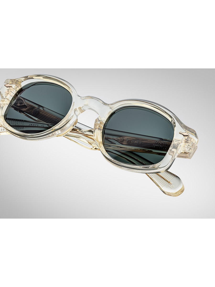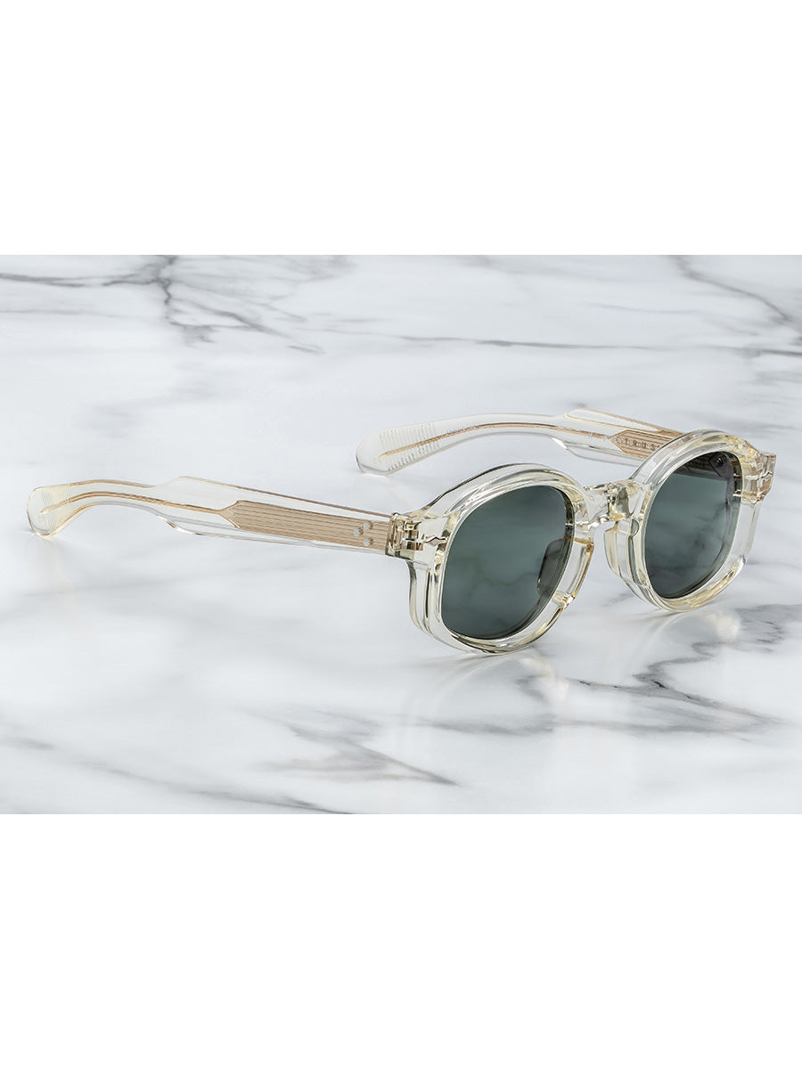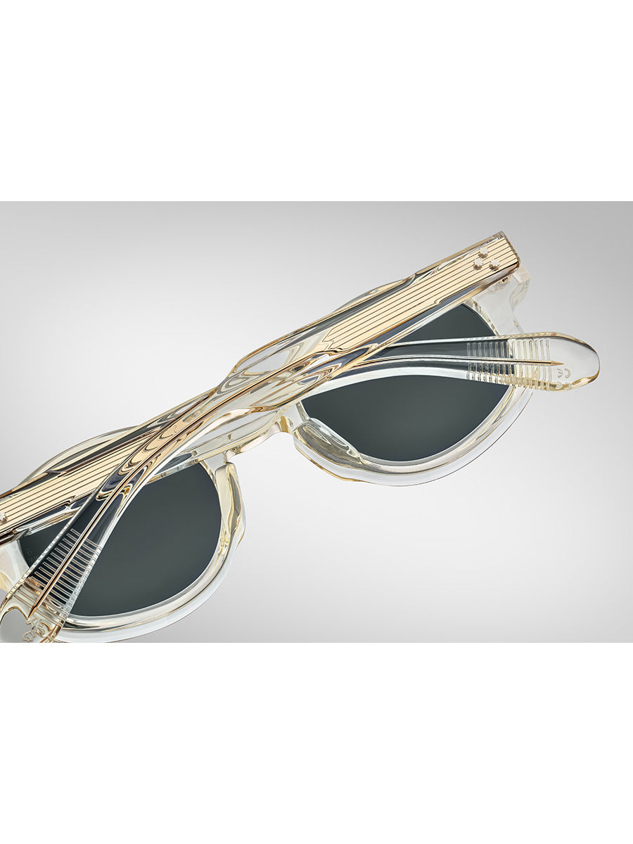 The sunglasses are part of the JMM CIRCA COLLECTION, distinct for their use of 10mm plant-based acetate blocks. Each style is inspired by historical motifs and features signature Art Deco-inspired details, including hairline-engraved wirecores and custom precious metals-plated spur-shaped rivets. The name CIRCA refers to the collection's direct inspiration from a library of vintage frames and cultural heroes spanning the last three centuries.