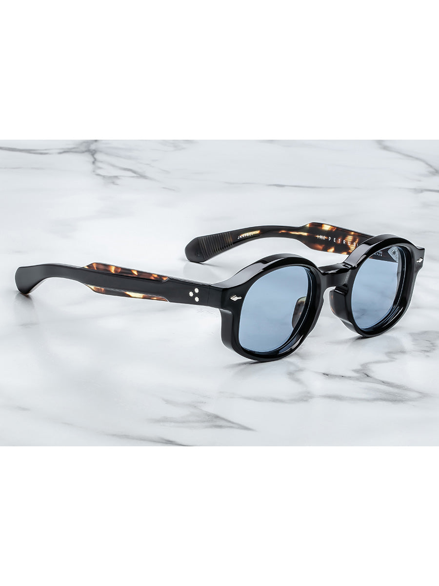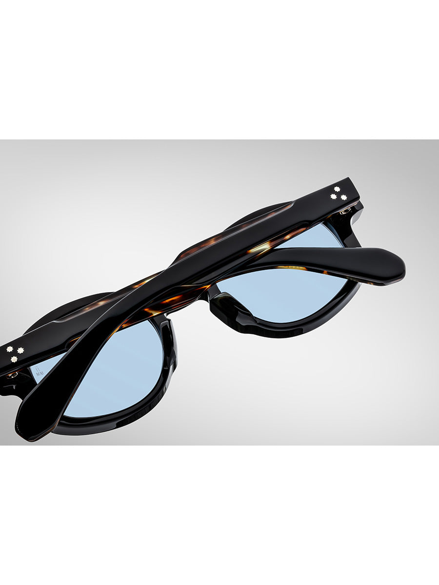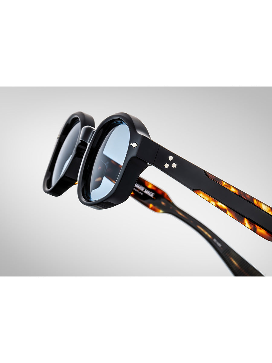 The sunglasses are part of the JMM CIRCA COLLECTION, distinct for their use of 10mm plant-based acetate blocks. Each style is inspired by historical motifs and features signature Art Deco-inspired details, including hairline-engraved wirecores and custom precious metals-plated spur-shaped rivets. The name CIRCA refers to the collection's direct inspiration from a library of vintage frames and cultural heroes spanning the last three centuries.