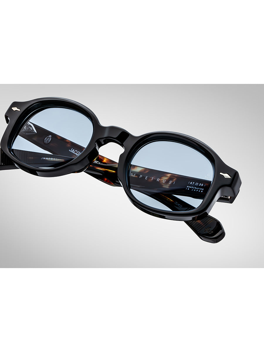 Jacques Marie Mage Petrus Noir sunglasses featuring hidden classic wirecores plated in silver palladium, custom 7-barrel hinges with refined hairline details, plated in silver palladium, spur-shaped rivets plated in silver palladium Inner-temple hallmarks foil-stamped in silver.