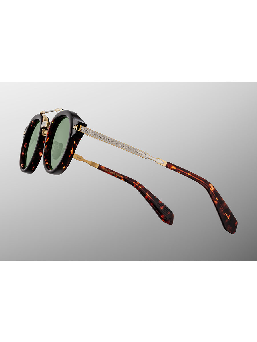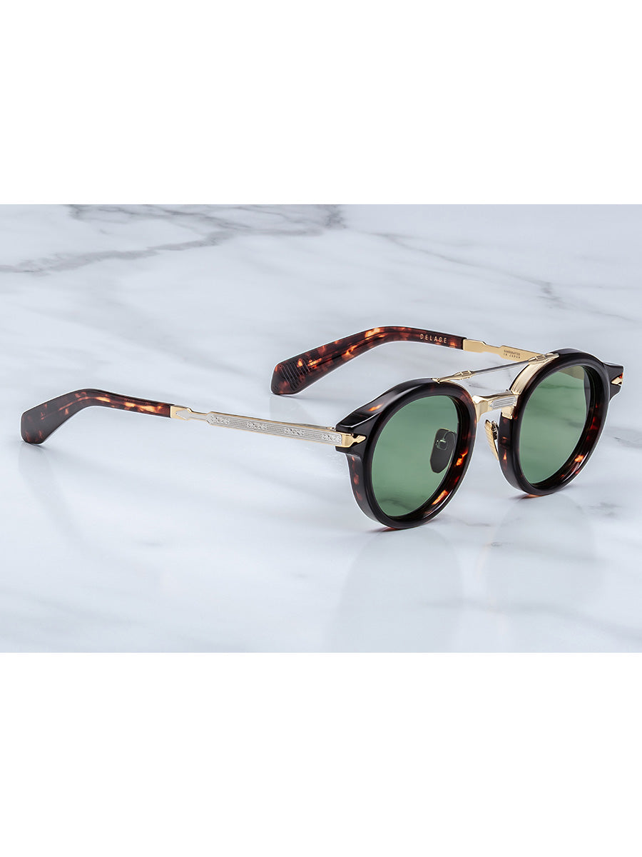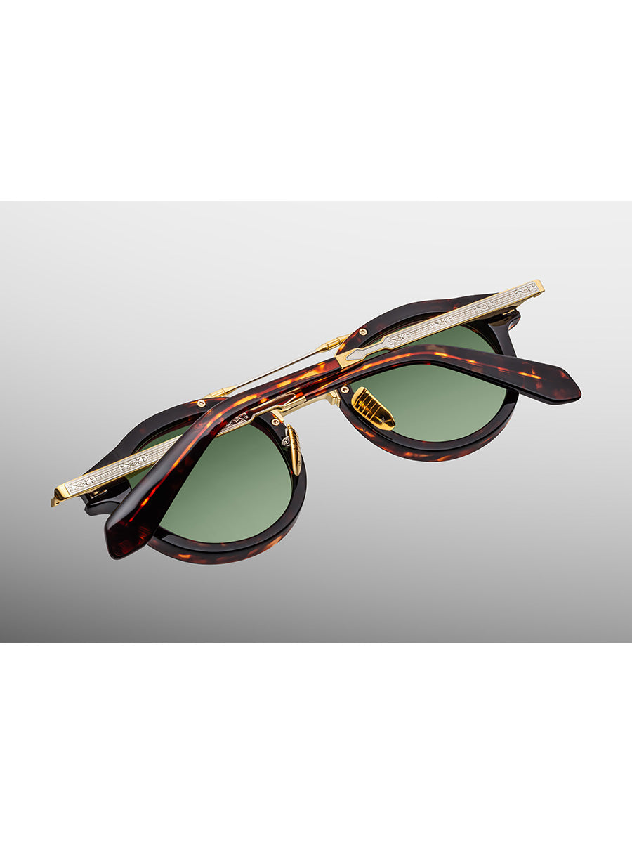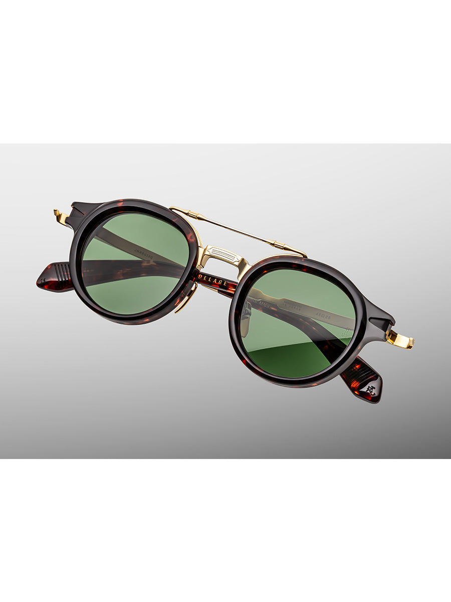 Jacques Marie Mage Delage Etna sunglasses featuring round frames inspired by the '50s with dark gold beta titanium structure, the brand's signature arrowhead monoblock hinge, and finely engraved temples with unique arrowhead motif.