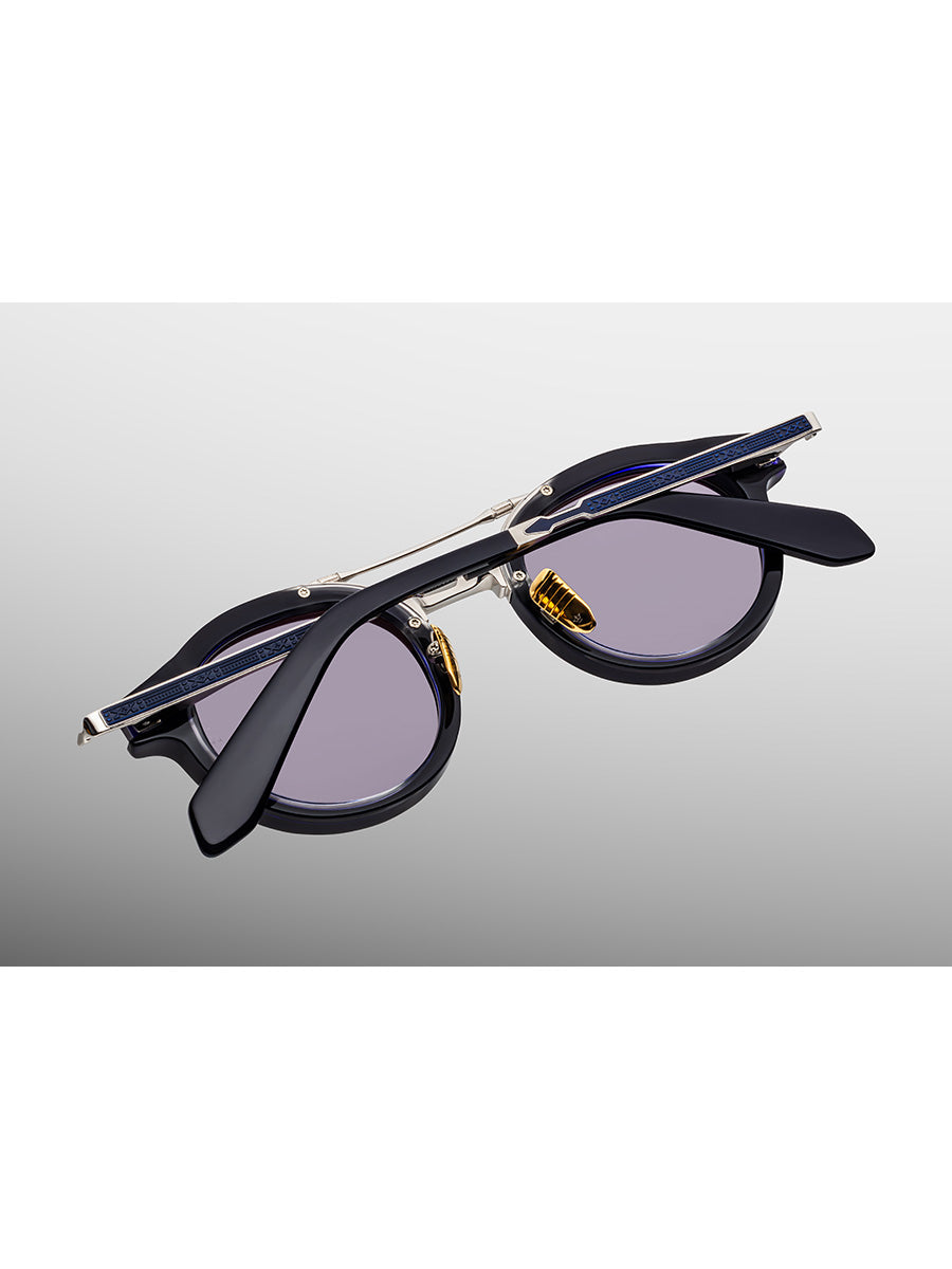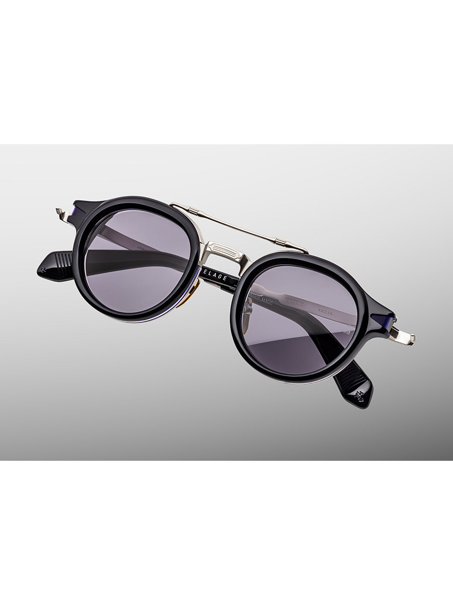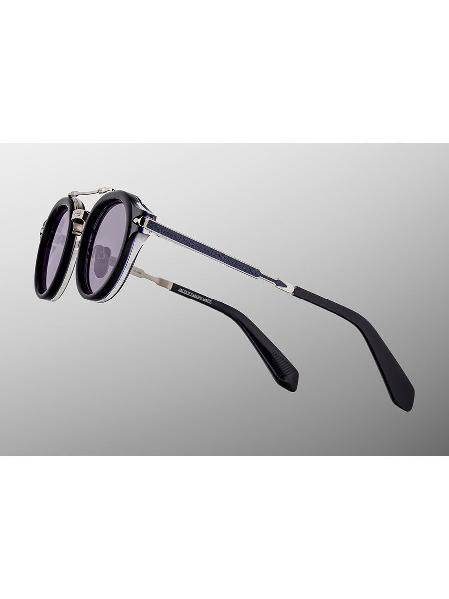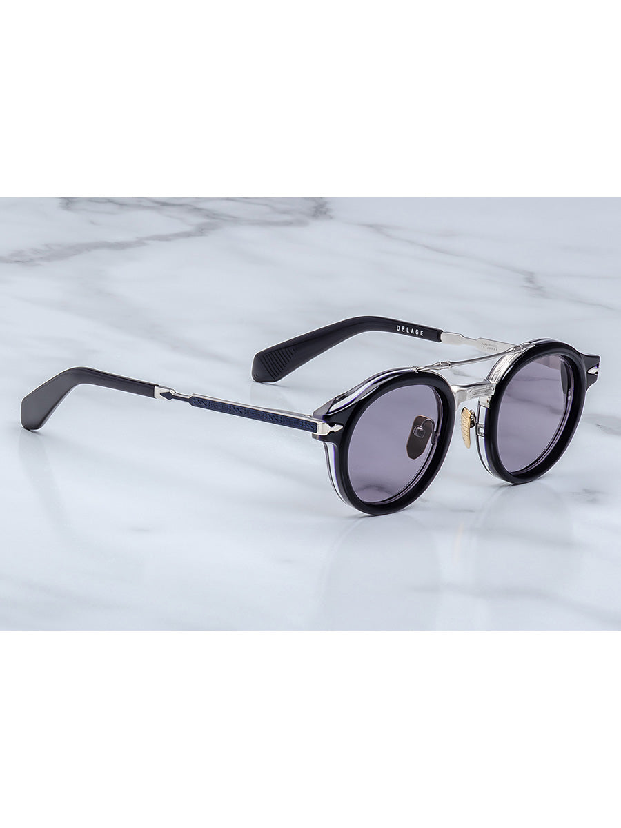 Jacques Marie Mage Delage Hudson sunglasses featuring round frames inspired by the '50s with silver 100% beta titanium structure, the brand's signature arrowhead monoblock hinge, and finely engraved temples with unique arrowhead motif.