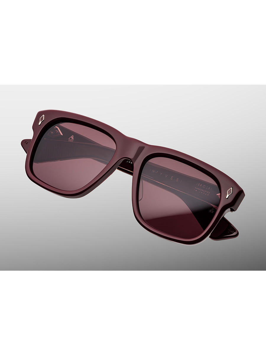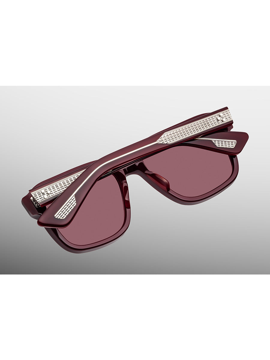 Jacques Marie Mage Yves Cassis sunglasses featuring signature sterling silver arrowhead front pins with bordeaux empire epoxy embellishments, custom hairline-engraved 7-barrel hinges plated in silver palladium, exposed hairline-engraved 'baguette' wirecores plated in silver palladium, signature spur-shaped rivet heads plated in silver palladium, inner temple hallmarks foil-stamped in silver.