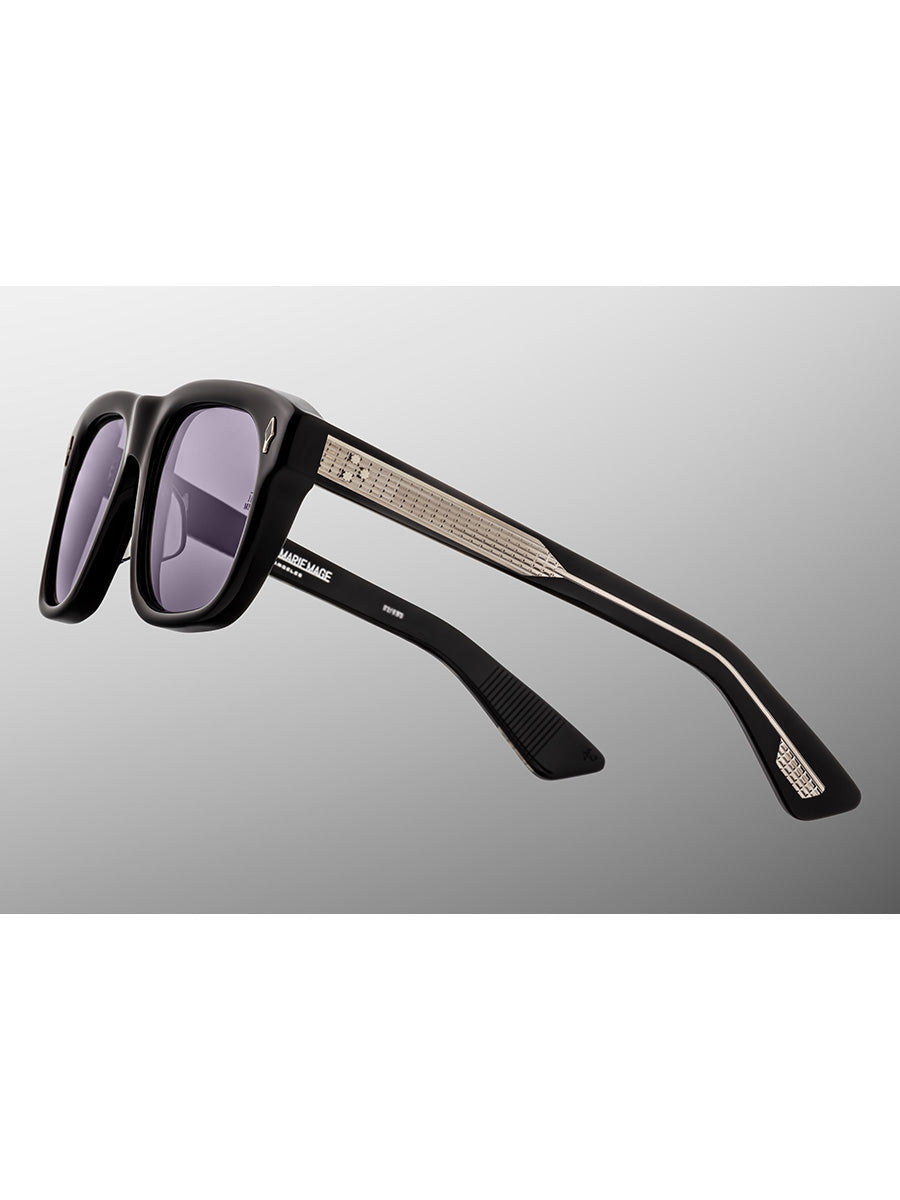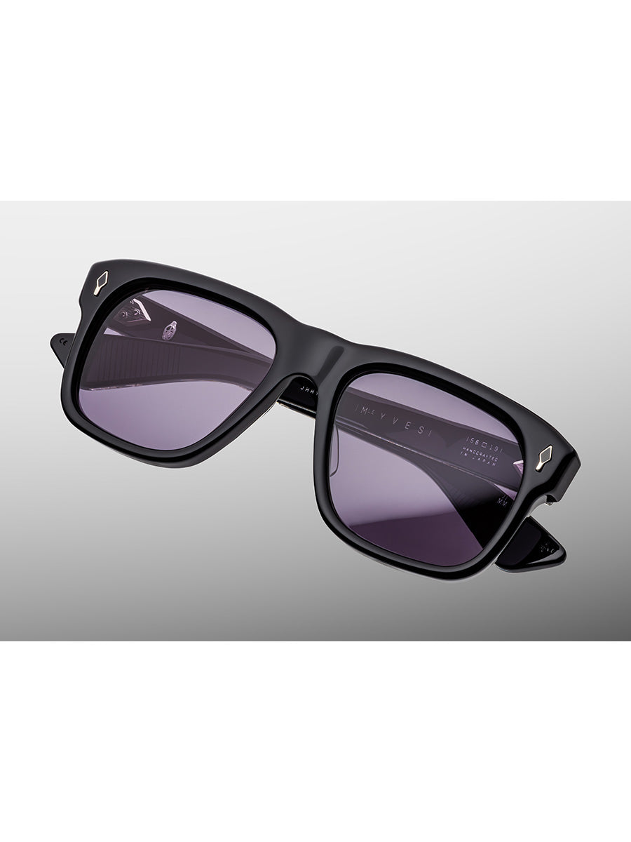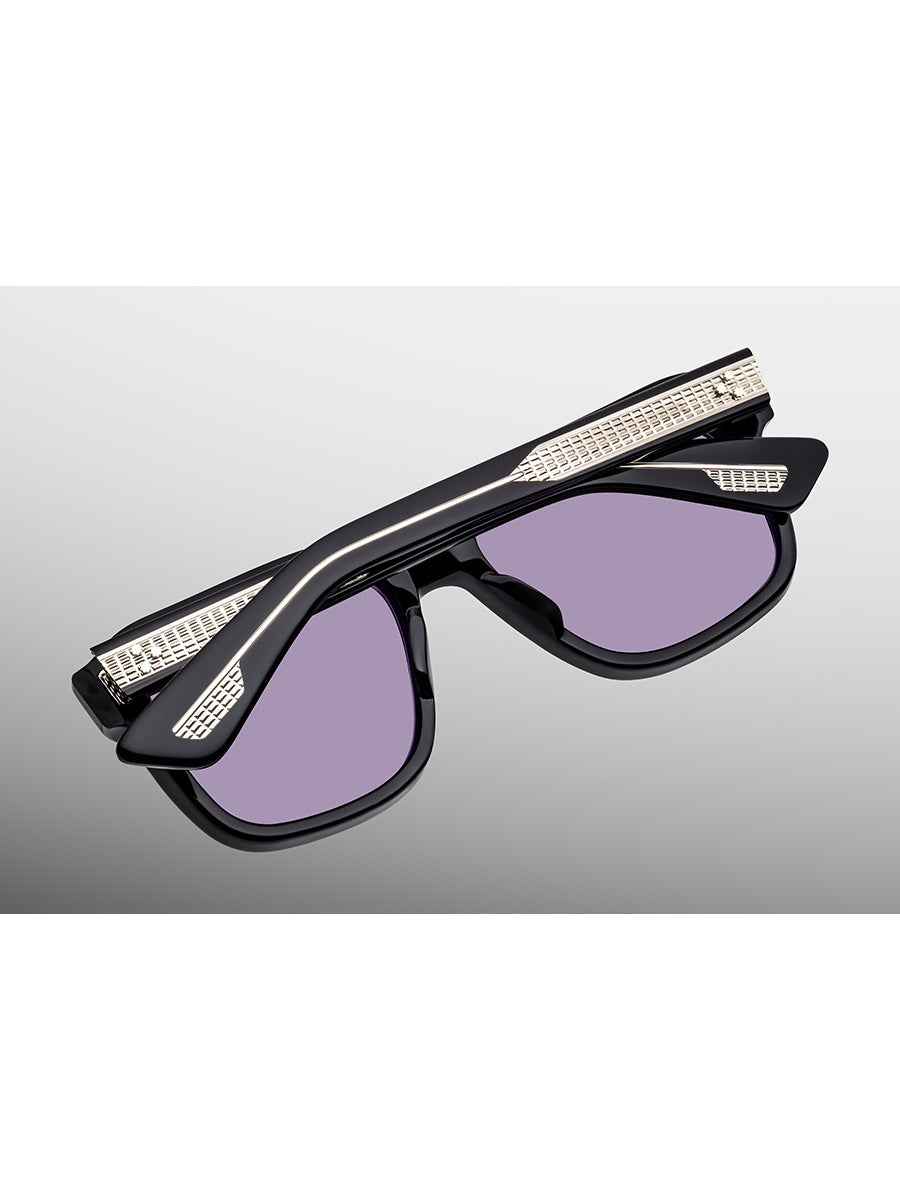 Jacques Marie Mage Yves Fumee sunglasses featuring signature sterling silver arrowhead front pins with black epoxy embellisments, custom hairline-engraved 7-barrel hinges plated in silver palladium, exposed hairline-engraved 'baguette' wirecores plated in silver palladium, signature spur-shaped rivet heads plated in silver palladium, inner temple hallmarks foil-stamped in silver.