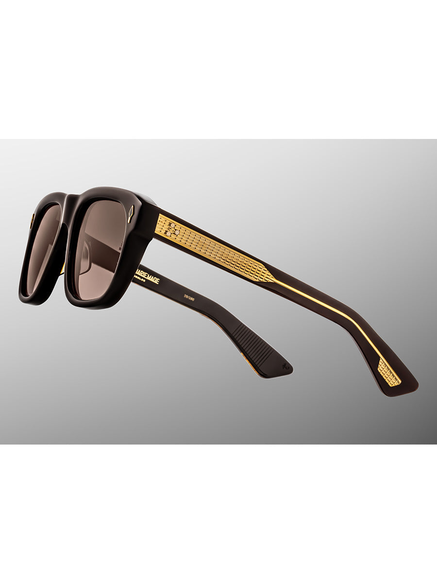 Jacques Marie Mage Yves Ganache sunglasses featuring signature arrowhead front pins plated in 18K dark gold with dark brown epoxy embellisments; custom hairline-engraved 5-barrel hinges plated in 18K dark gold; exposed hairline-engraved 'baguette' wirecores plated in 18K dark gold; signature spur-shaped rivet heads plated in 18K dark gold; inner temple hallmarks foil-stamped in gold.