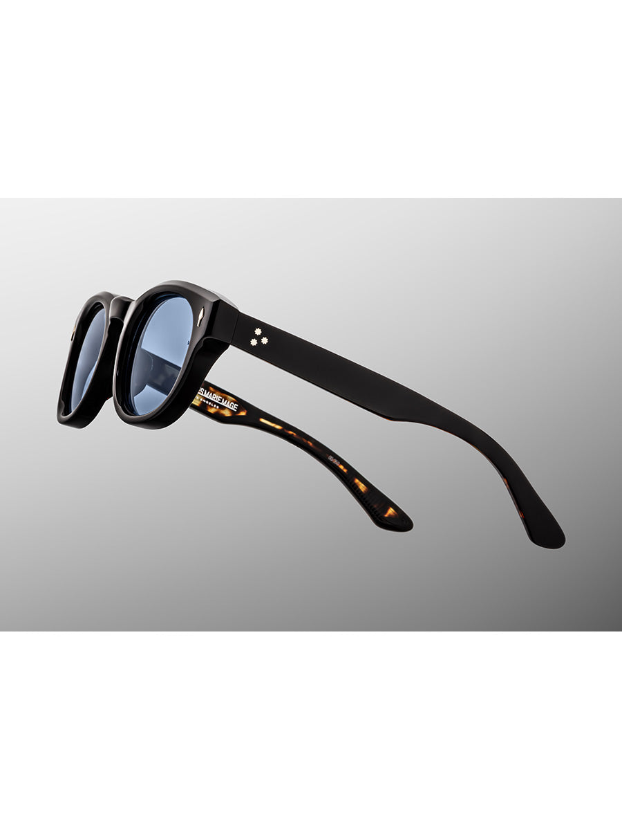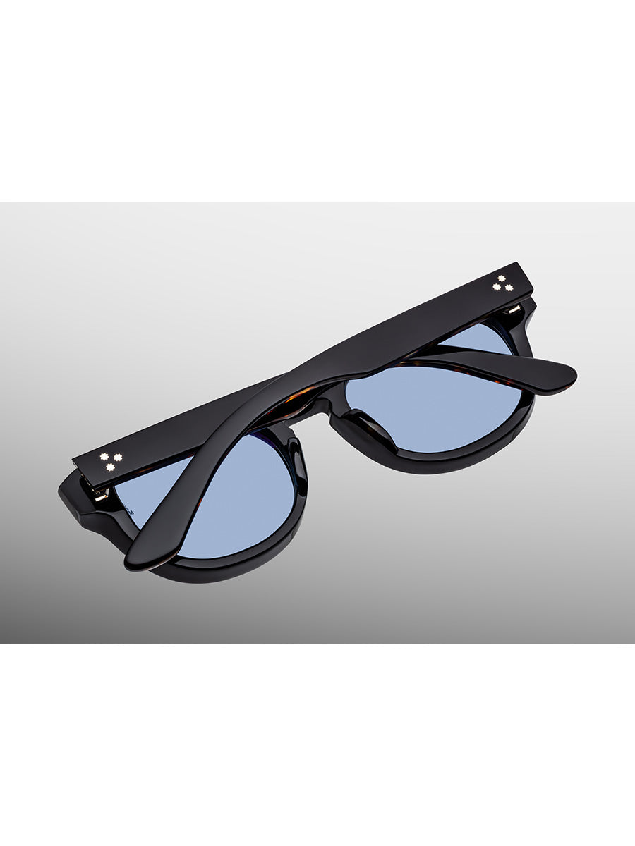 10mm cured cellulose acetate frame in polished black, with custom double-laminated temples composed of black exteriors and polished tortoise interiors