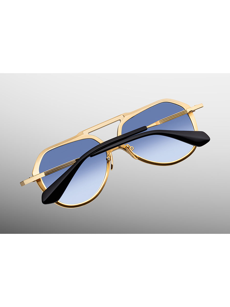 Other details include: titanium front finished in moon gold; titanium temples finished in moon gold with black epoxy; cured cellulose acetate temple tips in black; monoblock hinges in moon gold