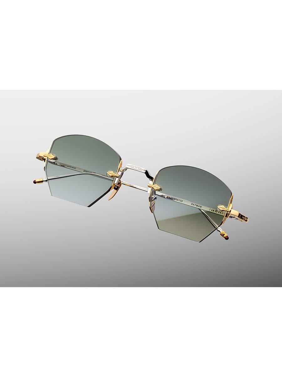 Jacques Marie Mage Oatman Electrum sunglasses for men and women, featuring unique hexagonal lenses with hand painted "tailfin" temple tips.