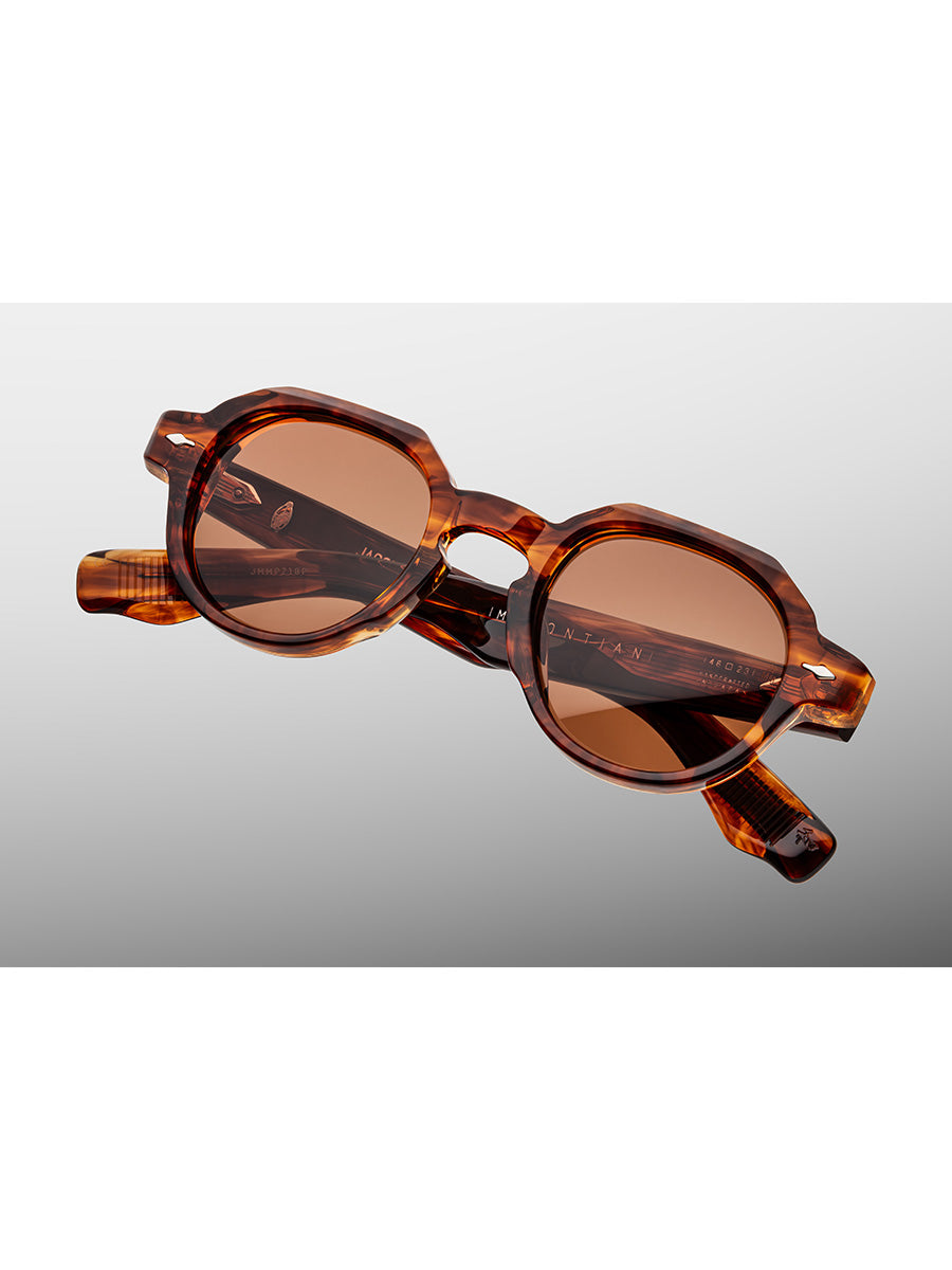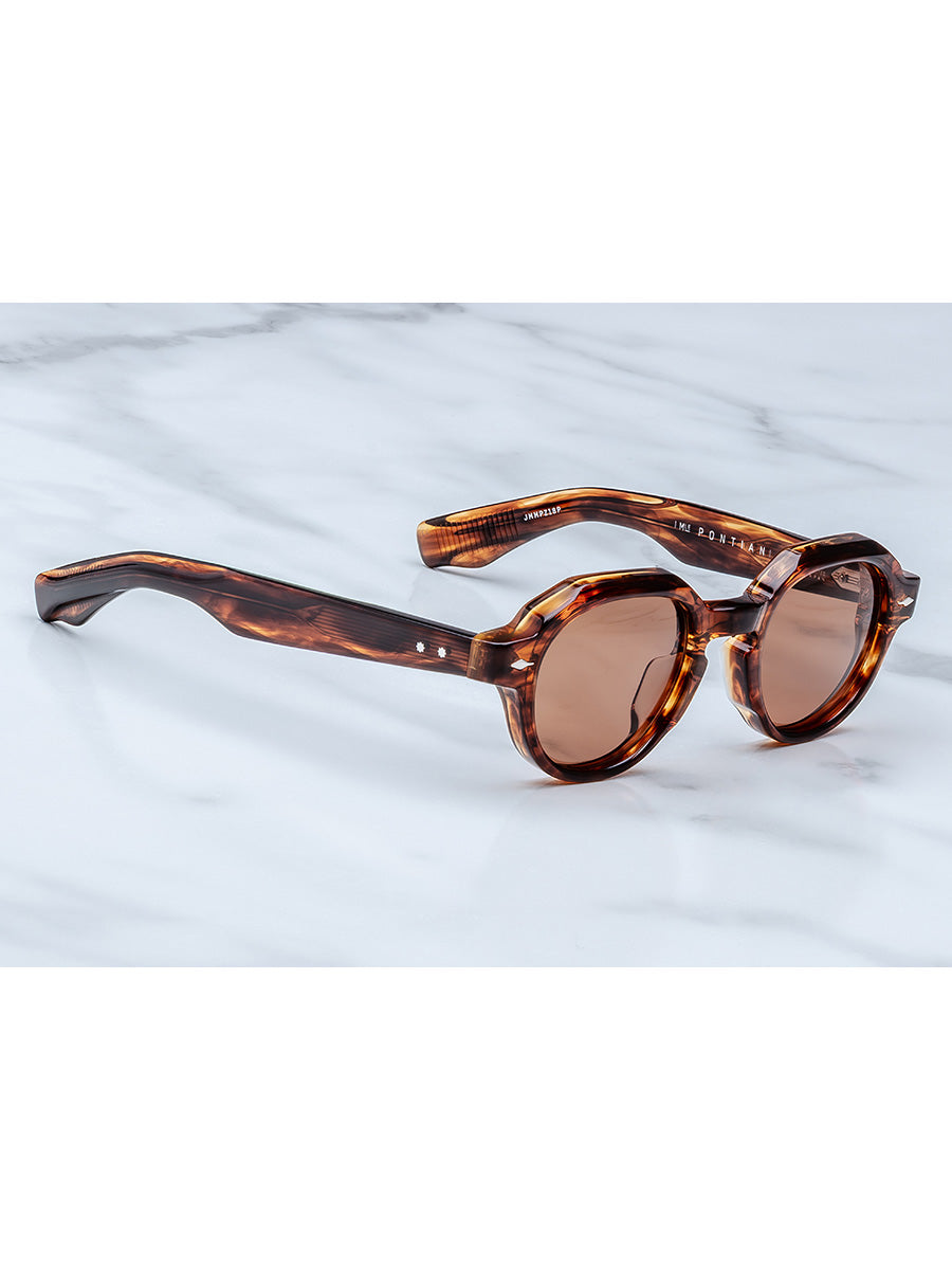 Jacques Marie Mage Pontian Bourbon sunglasses featuring round frames with a wide keyhole bridge and beveled brow, and the JMM signature sterling silver arrowhead front-pins, spur-shaped rivets and 'Classic' wirecores with Art Deco-inspired hairline details.