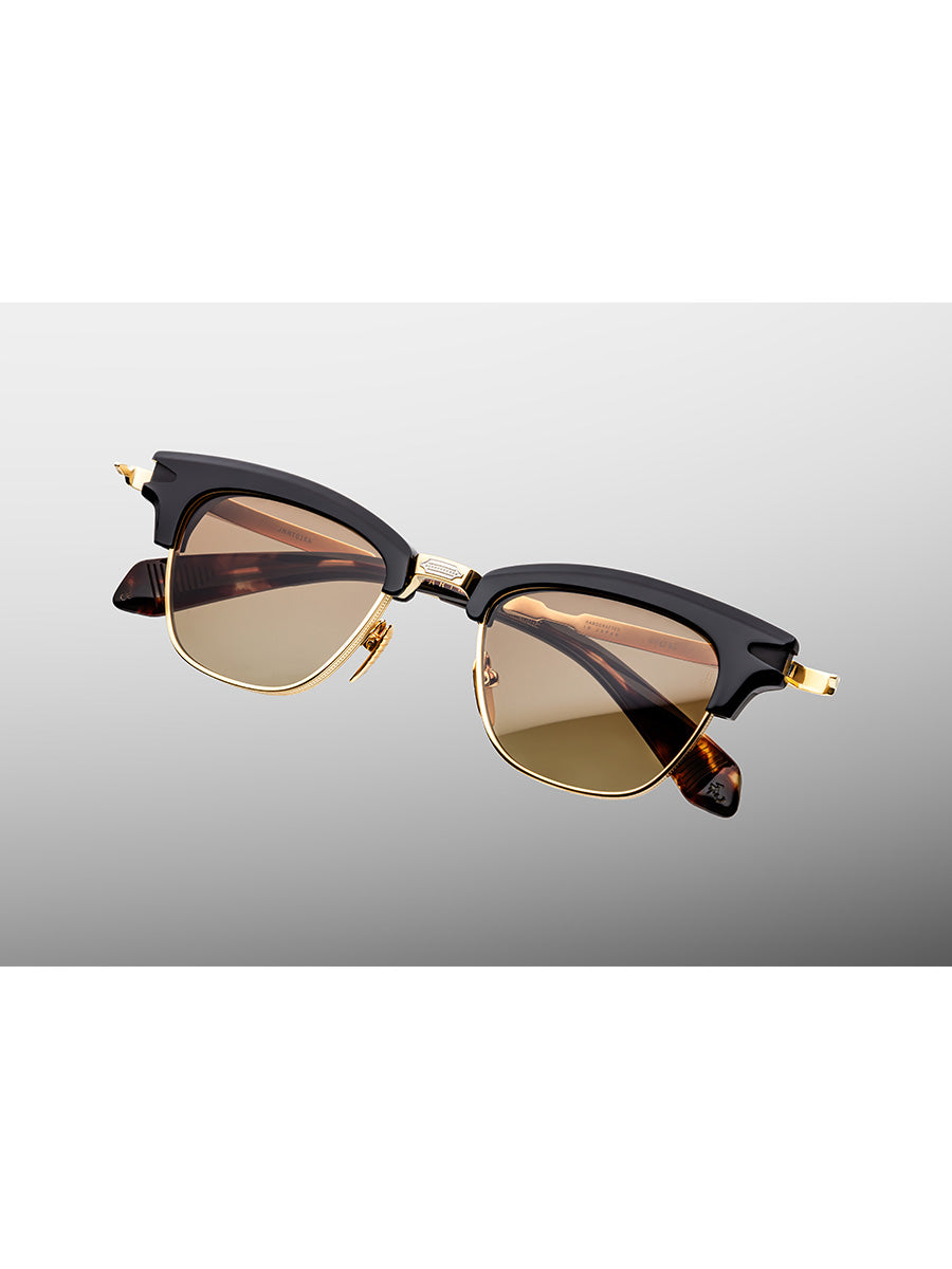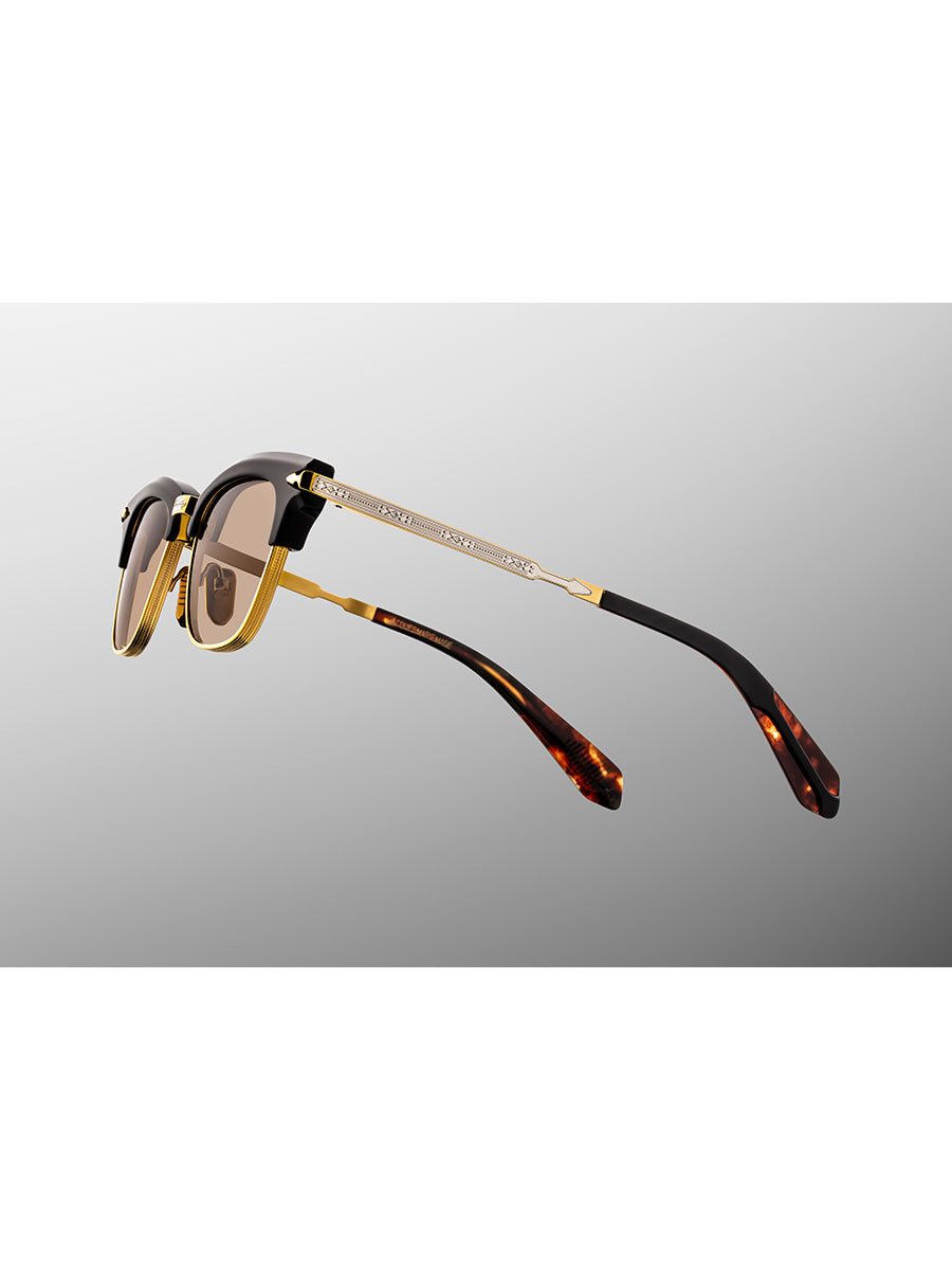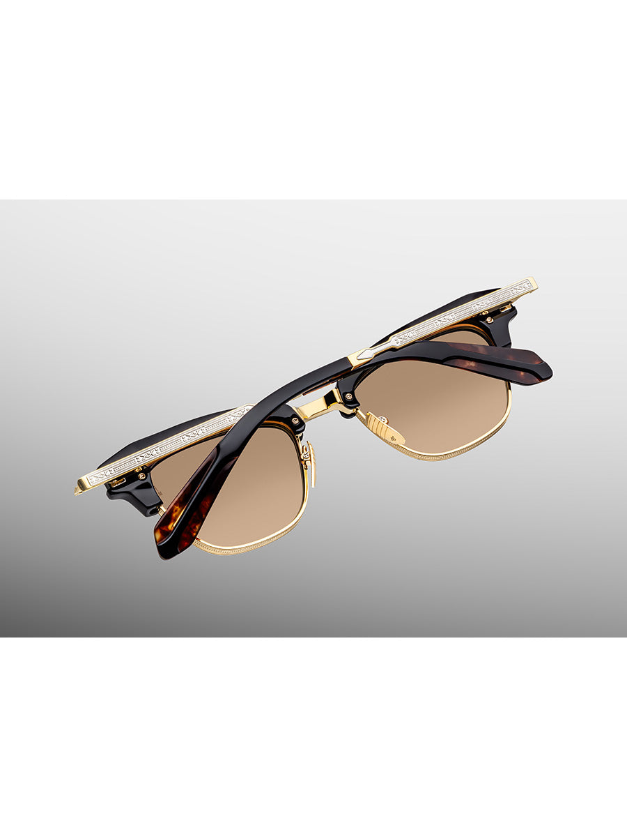 Other details include: black cellulose acetate brow, titanium dark gold-polished nose bridge with silver-finished embellishment, titanium dark gold-finished temples with engraved arrowhead motif and silver-finished details, custom titanium dark gold-finished arrowhead monoblock hinges, havana cellulose acetate temple tips, custom nose pads finished in luster gold with logo and hairline details