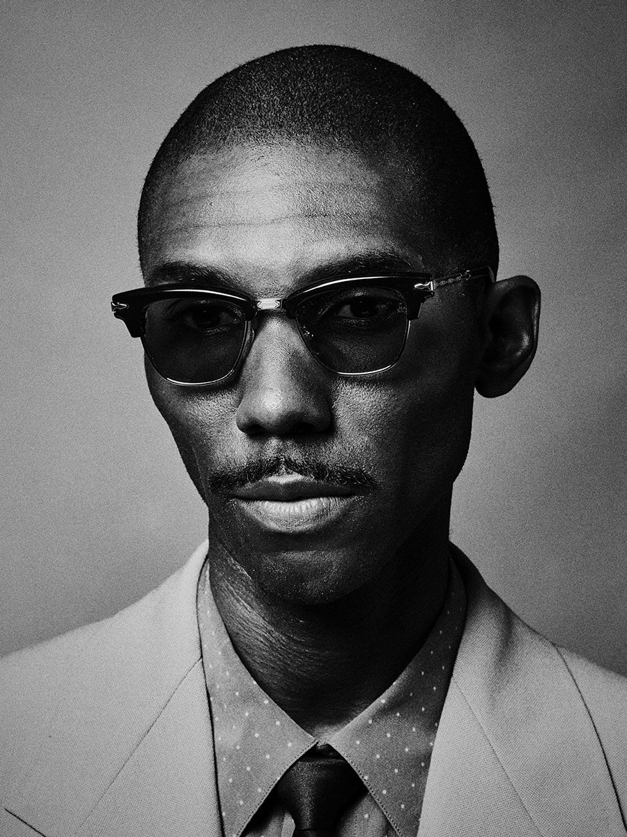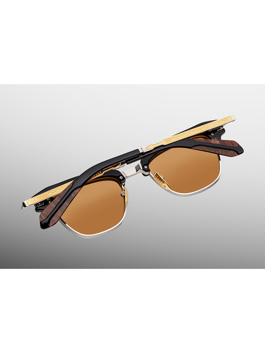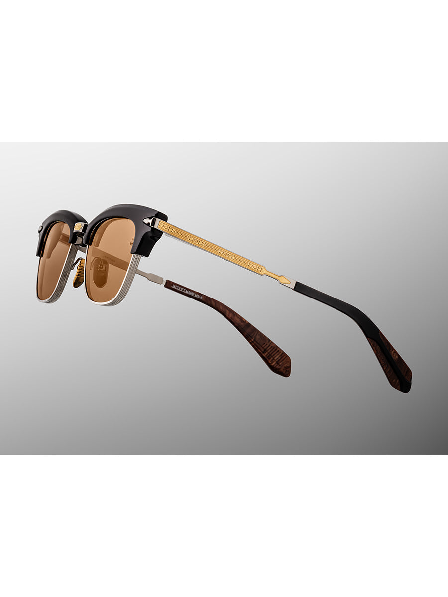 Jacques Marie Mage Sartre Noir X eunglasses featuring '50s-inspired frames with a sculptural acetate brow complemented by 4mm titanium eye rims with refined hairline details, a bridge with dual-tone embellishments, and titanium temples with unique arrowhead motif and sculptural acetate temple tips.