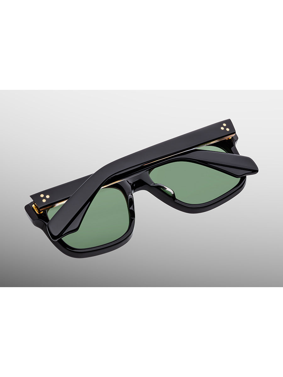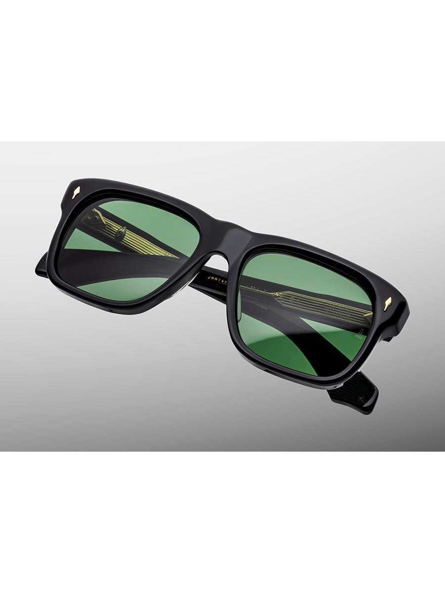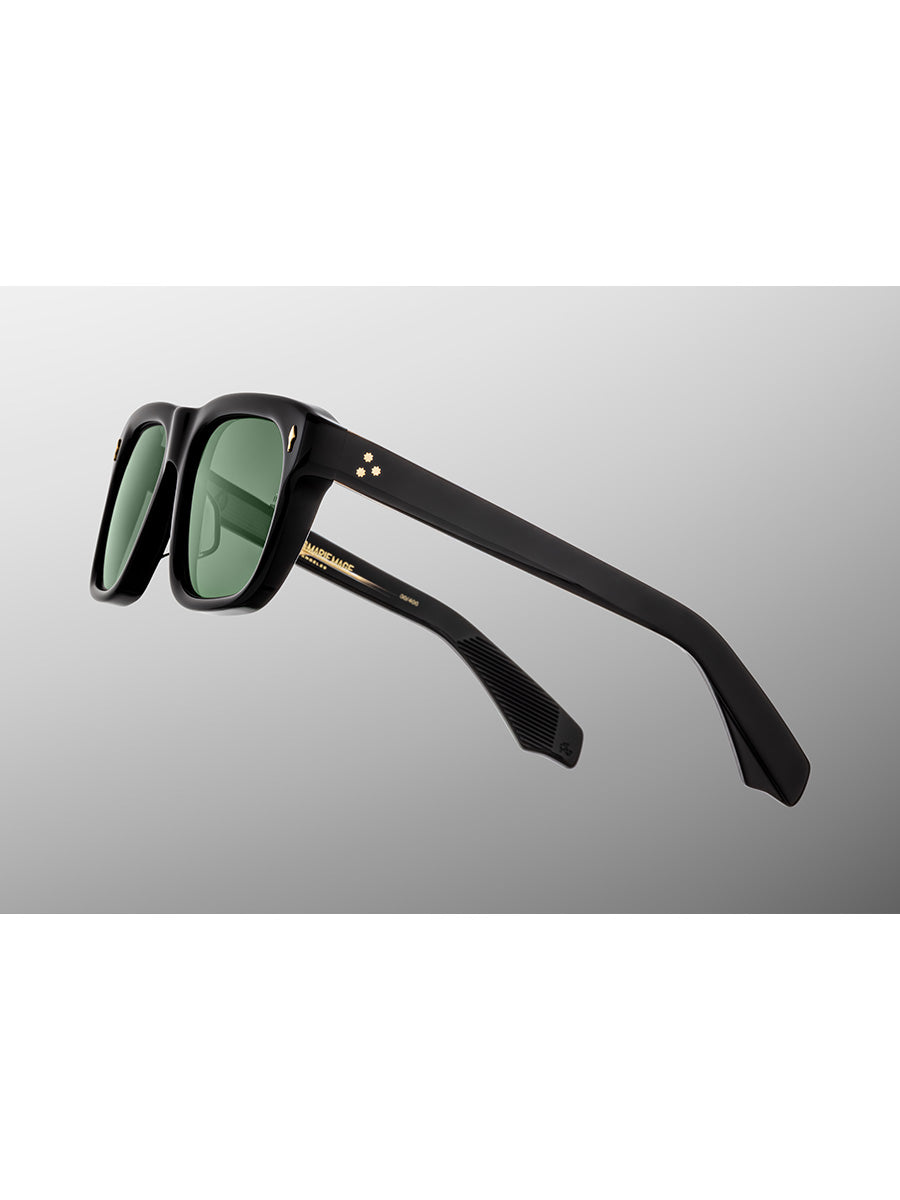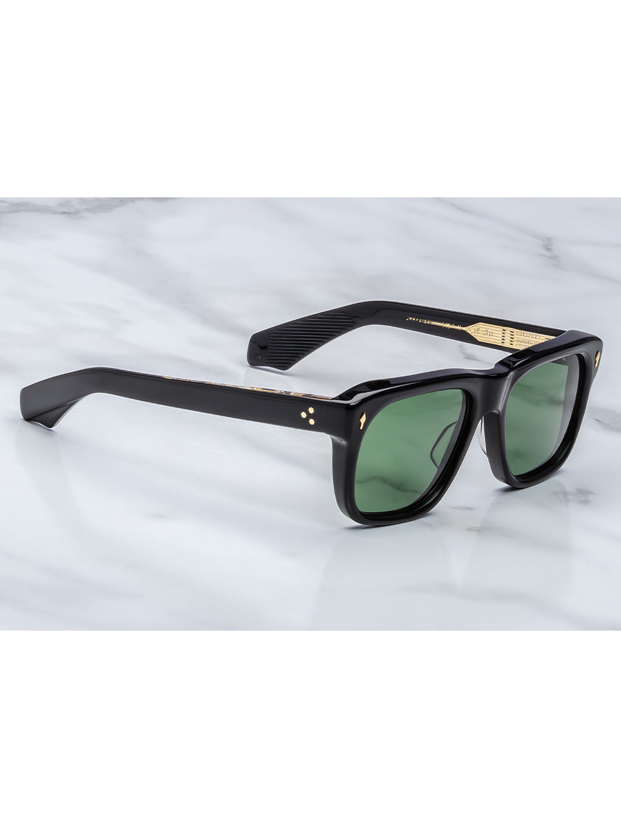 Jacques Marie Mage Yves Venom sunglasses, featuring 10mm cured cellulose acetate frames, custom double laminated acetate temples with metal hardware: signature arrowhead front pin, custom hairline engraved wire core design, tension-secured custom hinge with spur-shaped rivets, domed 3D metal cameo logo.