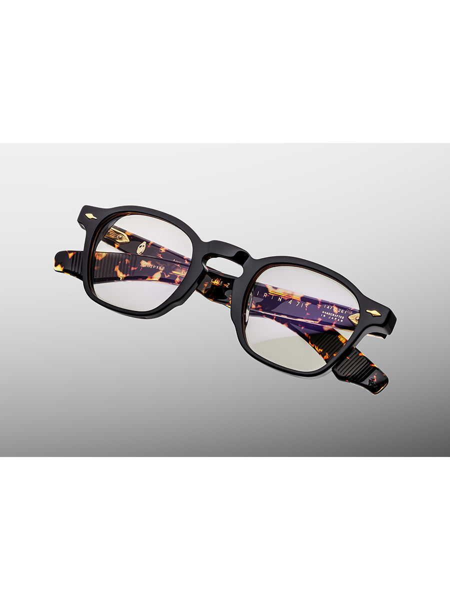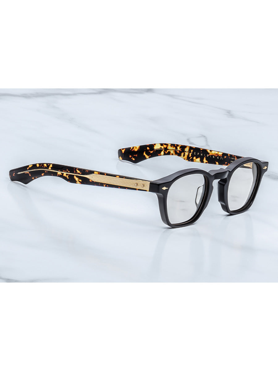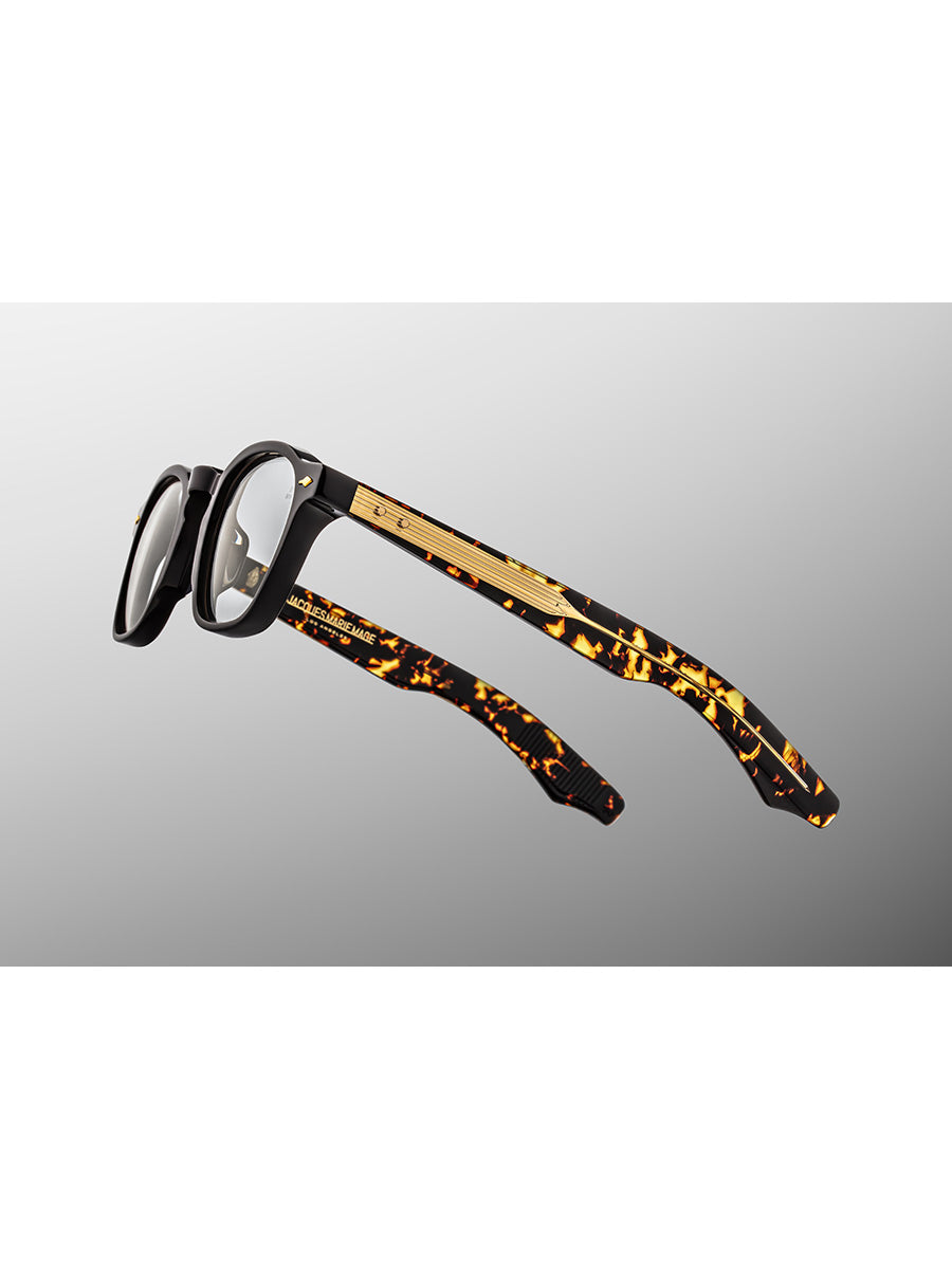 Jacques Marie Mage Zephirin 47 Tavern eyeglasses named after the cultural aesthete Pope Zephyrinus featuring dark gold signature arrowhead front pin, exposed dark gold wirecore ,dark gold tension-secured custom 5 barrel hinge with gold spur-shaped rivets.