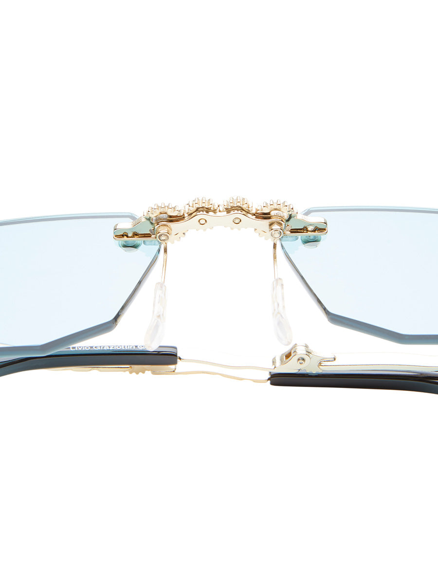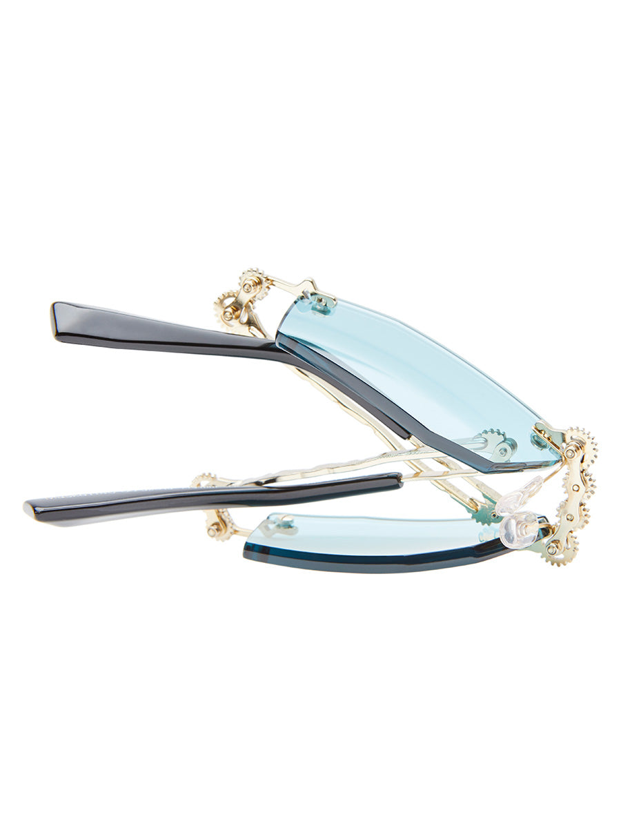 The glasses are foldable in four parts through gears on the temples and on the bridge. Each gear is equal parts aesthetic and function, the dynamic between them allows each of these pieces to be stored in a special pocket case. The “Machinery Rimless Series” will be delivered in an exclusive square box which includes a «Machinery Kit »and a dedicated hard case.