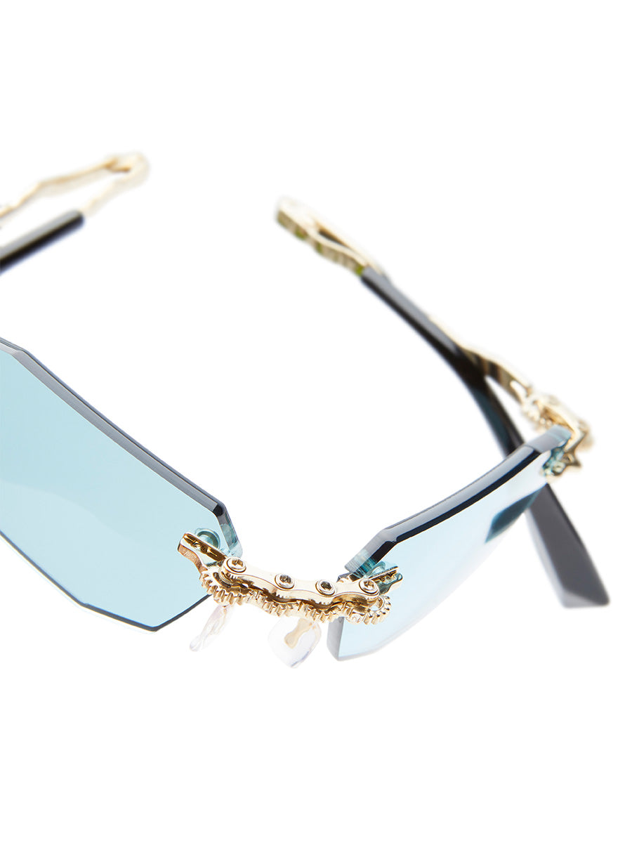 KUBORAUM H40 GG sunglasses part of the “Machinery Rimless Series”, with angular rimless lenses, silver handcrafted nose bridge and temples, fitted with black temple tips.