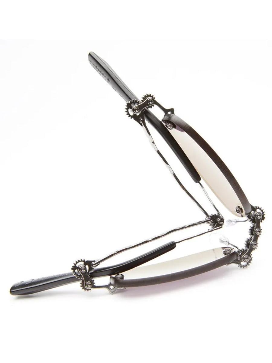 The glasses are foldable in four parts through gears on the temples and on the bridge. Each gear is equal parts aesthetic and function, the dynamic between them allows each of these pieces to be stored in a special pocket case. The “Machinery Rimless Series” will be delivered in an exclusive square box which includes a "Machinery Kit" and a dedicated hard case.