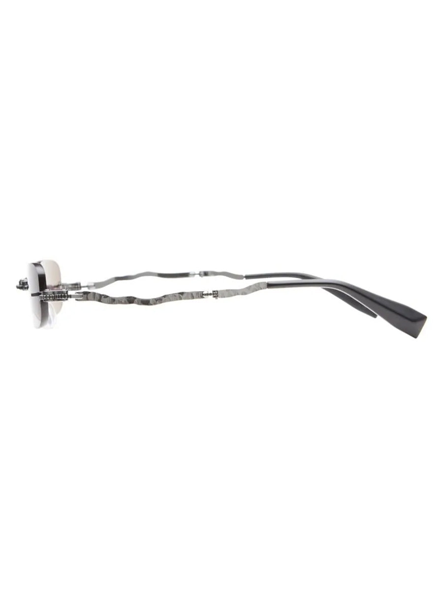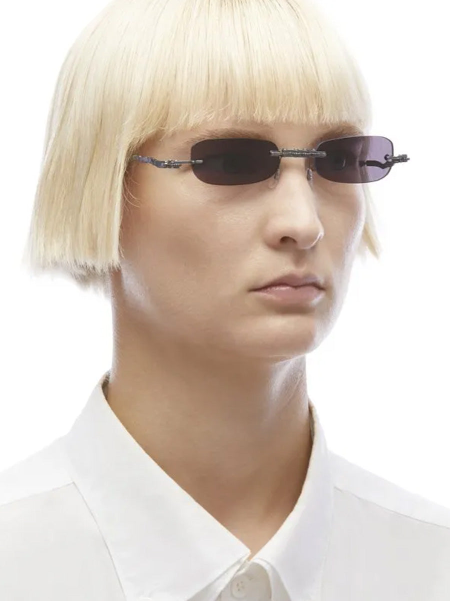 KUBORAUM Mask H47 BB sunglasses part of the “Machinery Rimless Series”, with metallic nose bridge and temples, fitted with acetate temple tips.