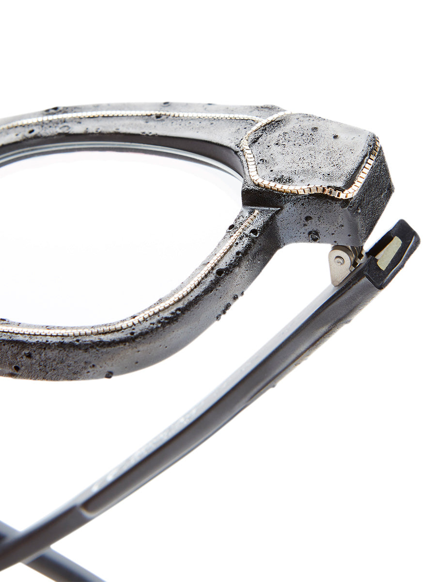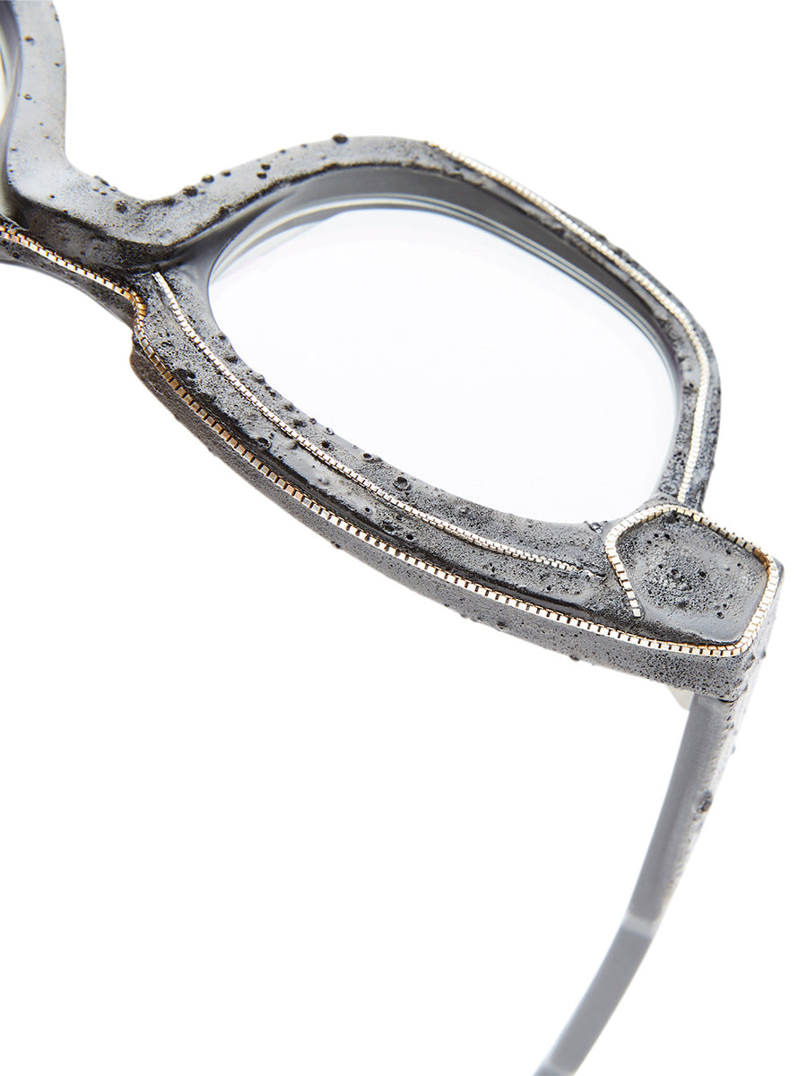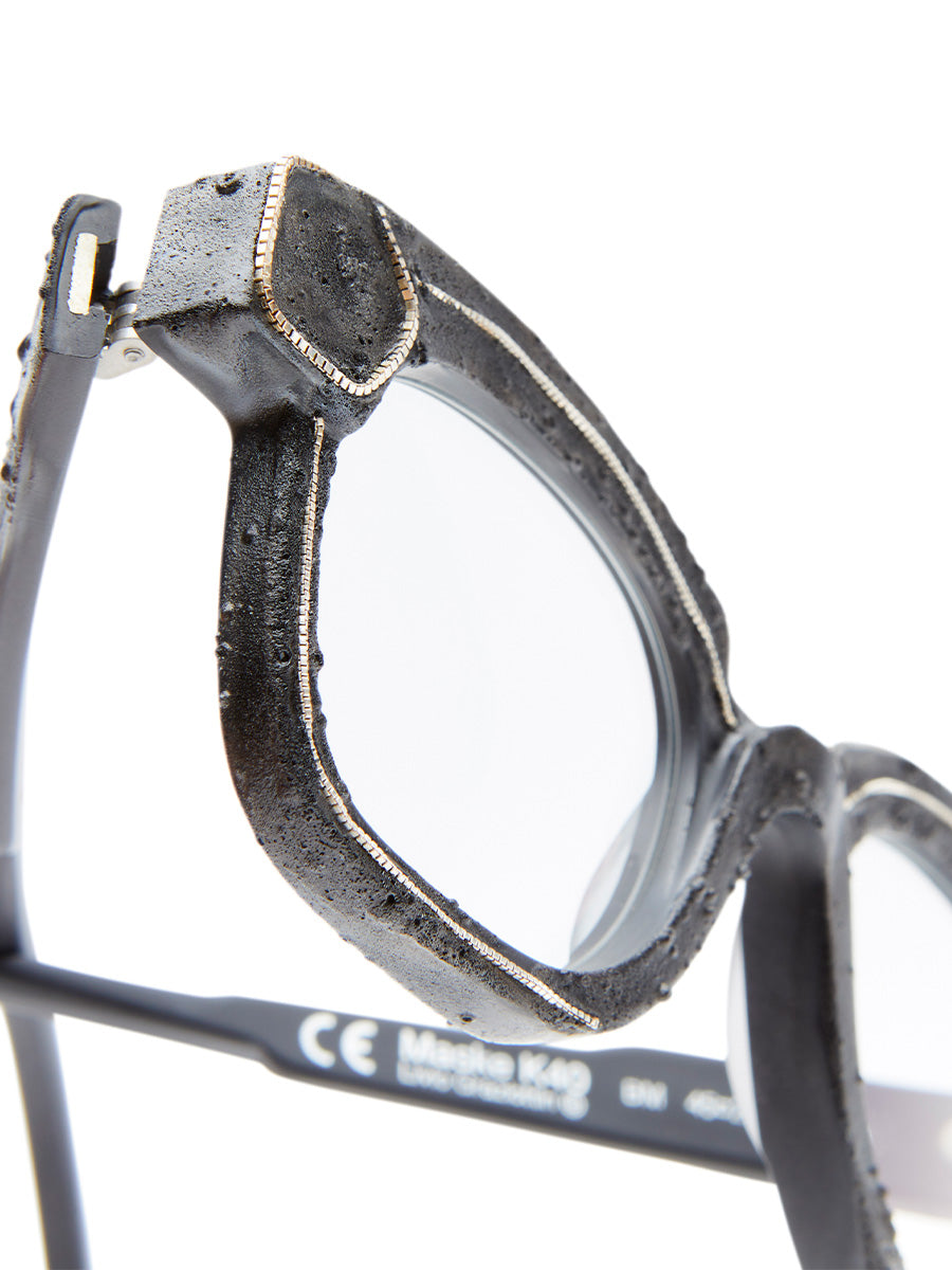 KUBORAUM Mask K40 BM SI eyeglasses featuring rectangular frames with cat-eye angles with hand engraved silver chain details.