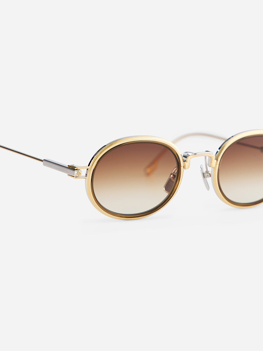 SATO Acamar-T S1103 Yellow Gold and Platinum sunglasses featuring oval frames crafted from titanium with yellow gold and platinum coating, and a brown chocolate Takiron rim insert.