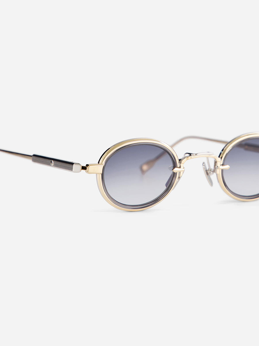 SATO Algedi-T LG/P-1 Lunar Gold and Platinum sunglasses featuring oval frames crafted from titanium with lunar gold and platinum coating, and a crystal grey Takiron rim insert.