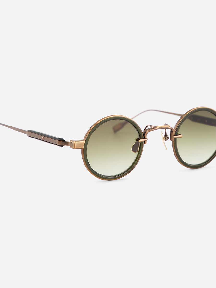 SATO Naos AB/O-1 Antique Bronze and Olive sunglasses featuring frames crafted from pure Antique Bronze Japanese titanium, with Olive Japanese Takiron acetate rim inserts and Takiron acetate details on the temples.