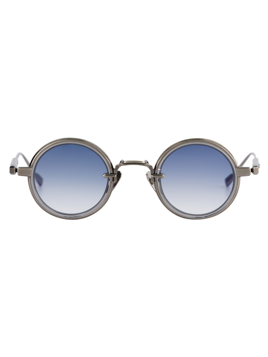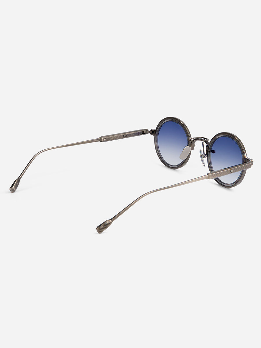 SATO Rotanev-T AS-1 Antique Silver sunglasses featuring round titanium frame, with antique silver coating and crystal grey takiron rim insert.