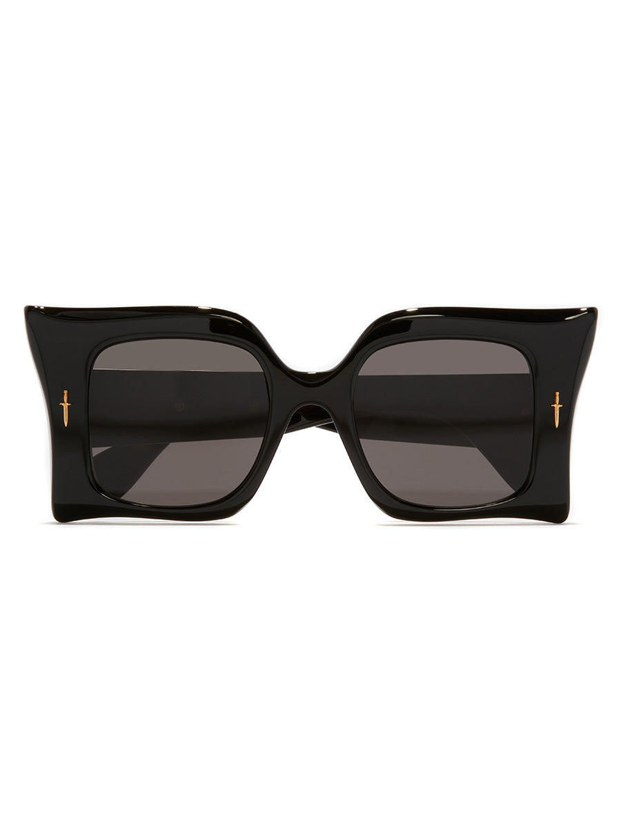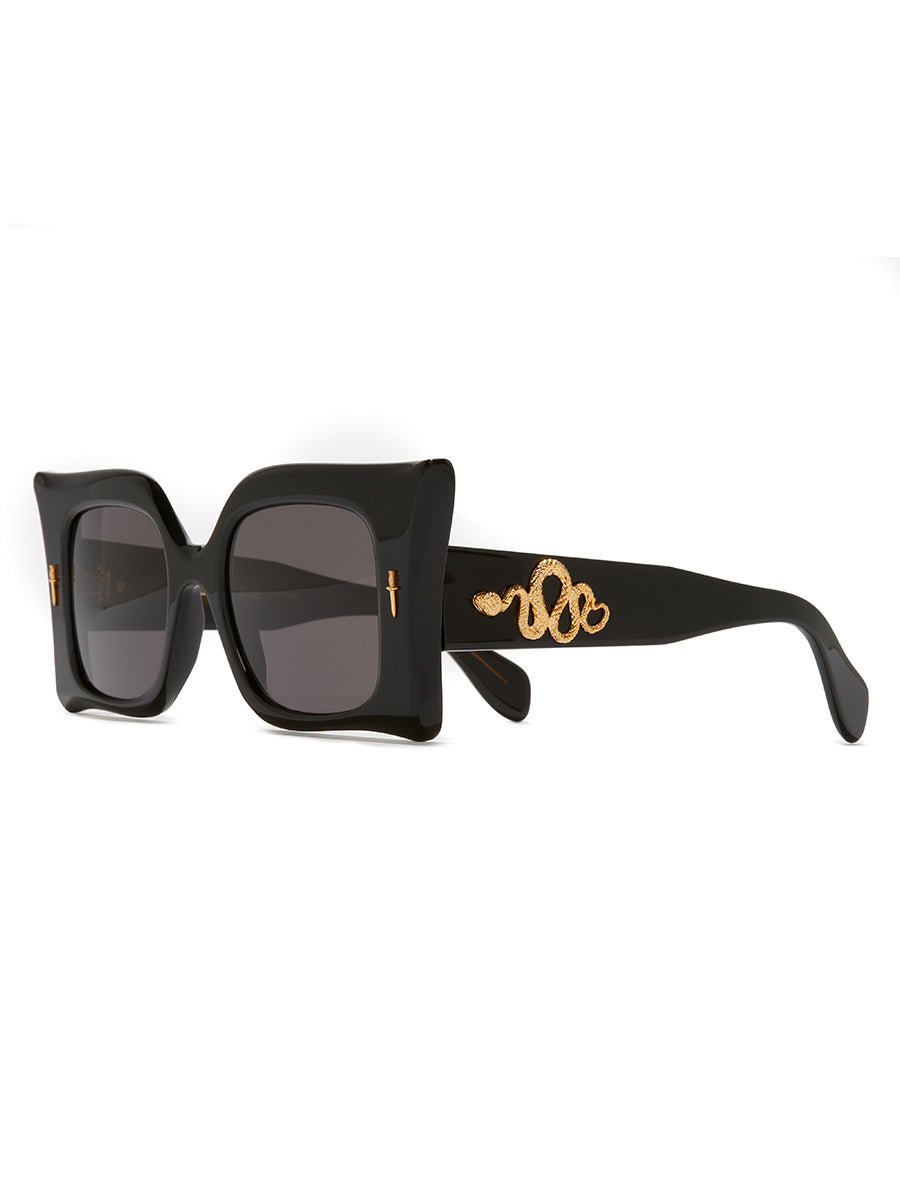 The Great Frog x Cutler and Gross Medusa 24K Gold Black on Oil sunglasses, featuring a maximalist design is carved and bevelled to a faceted profile worthy of Medusa. The frame is adorned with metalwork shaped in Dagger and Viper pins cast in Sterling Silver and plated in 24K Gold.