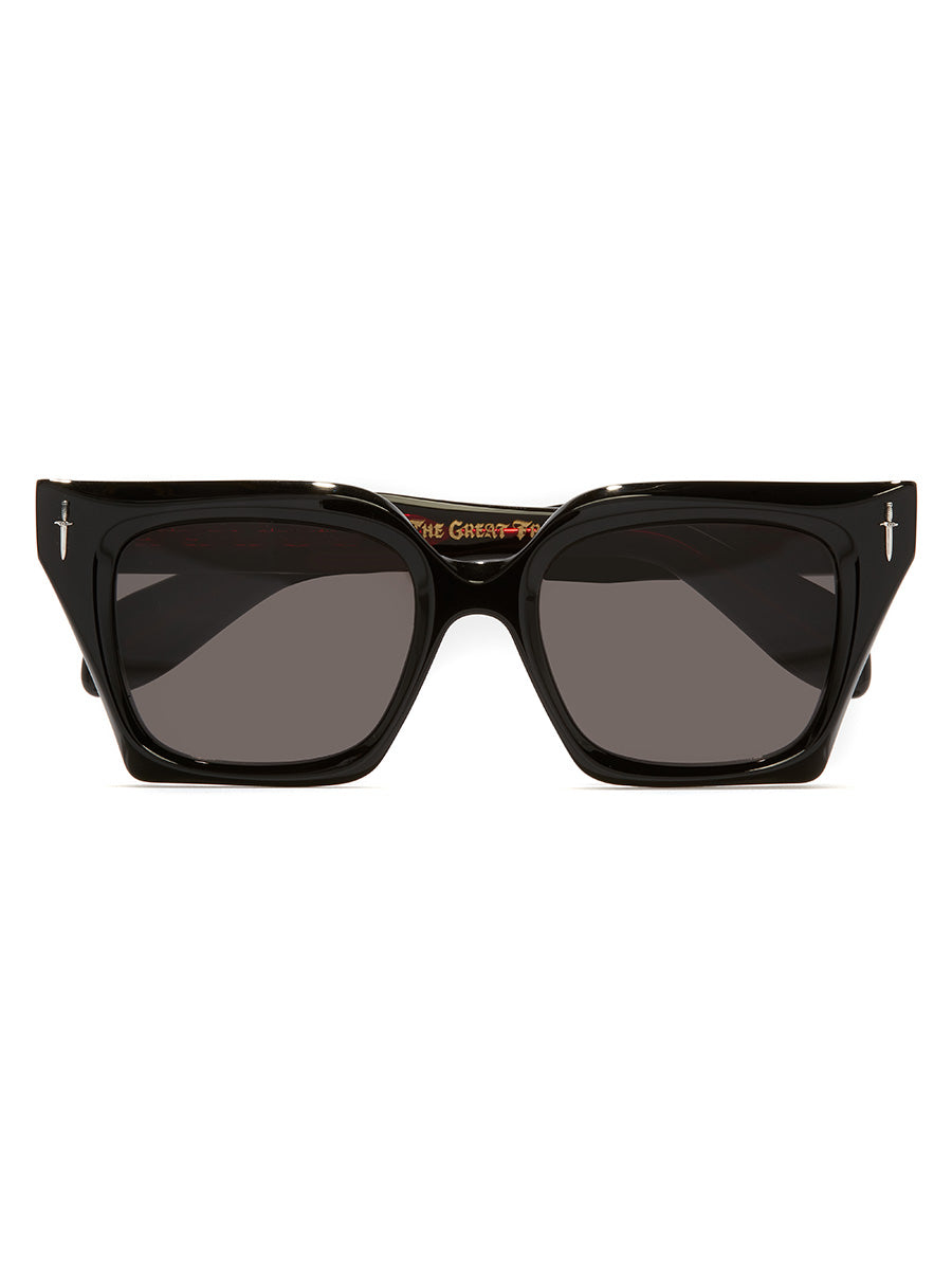 The Great Frog x Cutler and Gross Prometheus Black on Red sunglasses, featuring rectangular frames with up-swept lugs that mirror licking flames gilded with Sterling Silver Dagger pins.