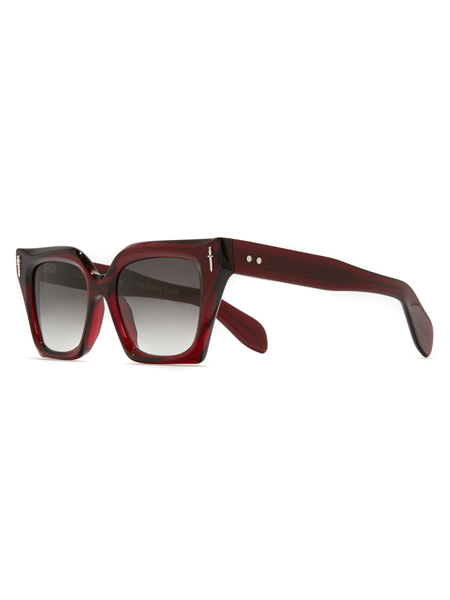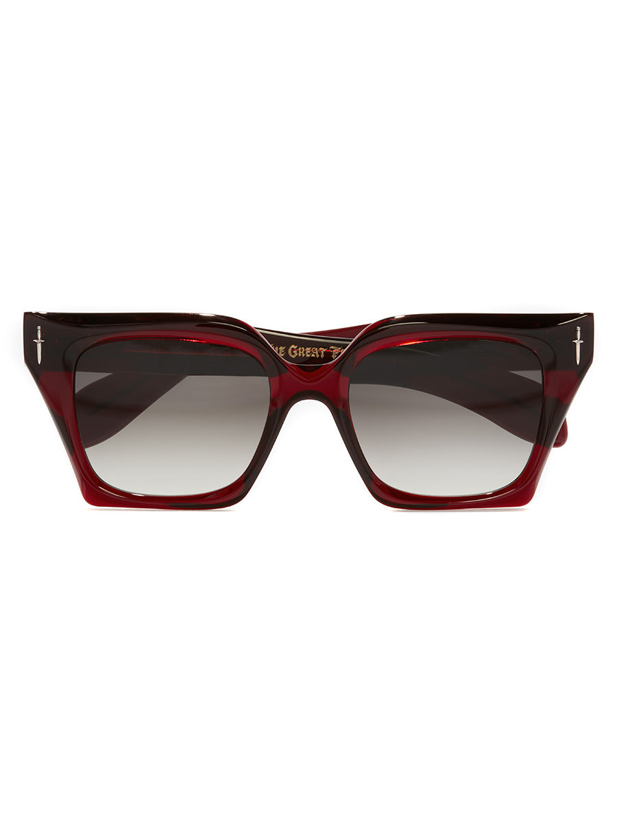 The Great Frog x Cutler and Gross Prometheus Bordeaux sunglasses, featuring rectangular frames with up-swept lugs that mirror licking flames gilded with Sterling Silver Dagger pins.