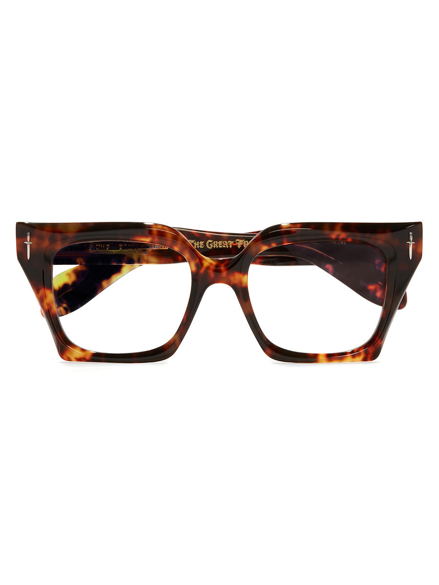 The Great Frog x Cutler and Gross Prometheus Vintage Havana eyeglasses, featuring rectangular frames with up-swept lugs that mirror licking flames gilded with Sterling Silver Dagger pins.