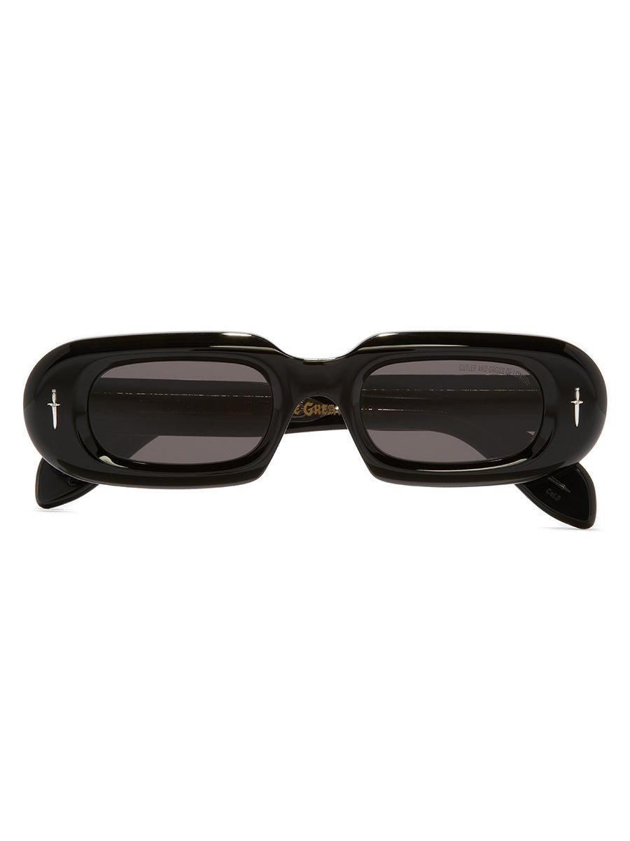 The Great Frog x Cutler and Gross Rapture Black on Crystal sunglasses showcase narrow oval frames with a straight browbar and curved edges. Crafted in polished Sterling Silver, they feature The Great Frog’s signature Dagger emblem on the front and Lock Down chain core wire through the temples. The design pays tribute to gothic rave album covers from the ‘70s.