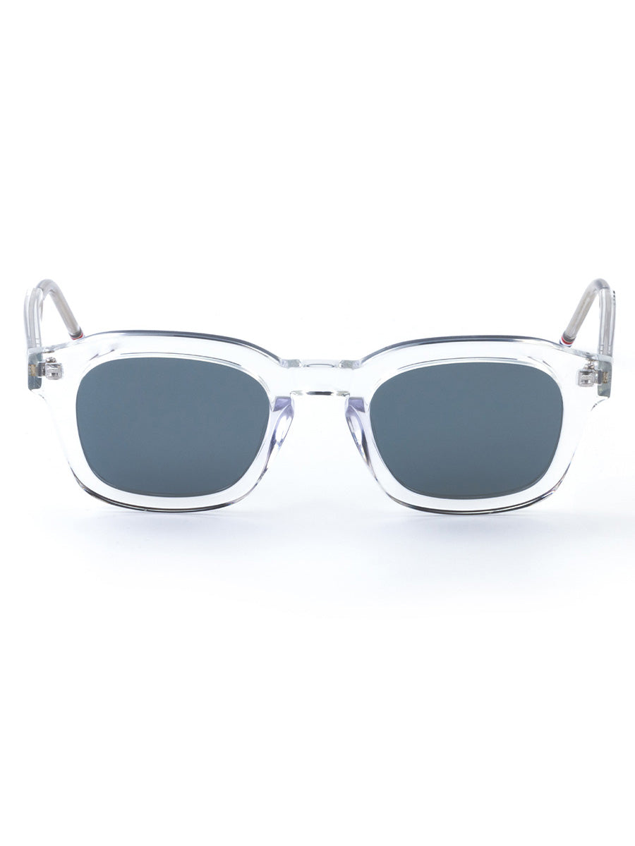 Thom Browne 412A 000 Clear Rectangular sunglasses handcrafted from acetate, featuring signature 4-bar details and striped enamel temple tips.