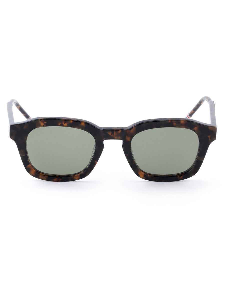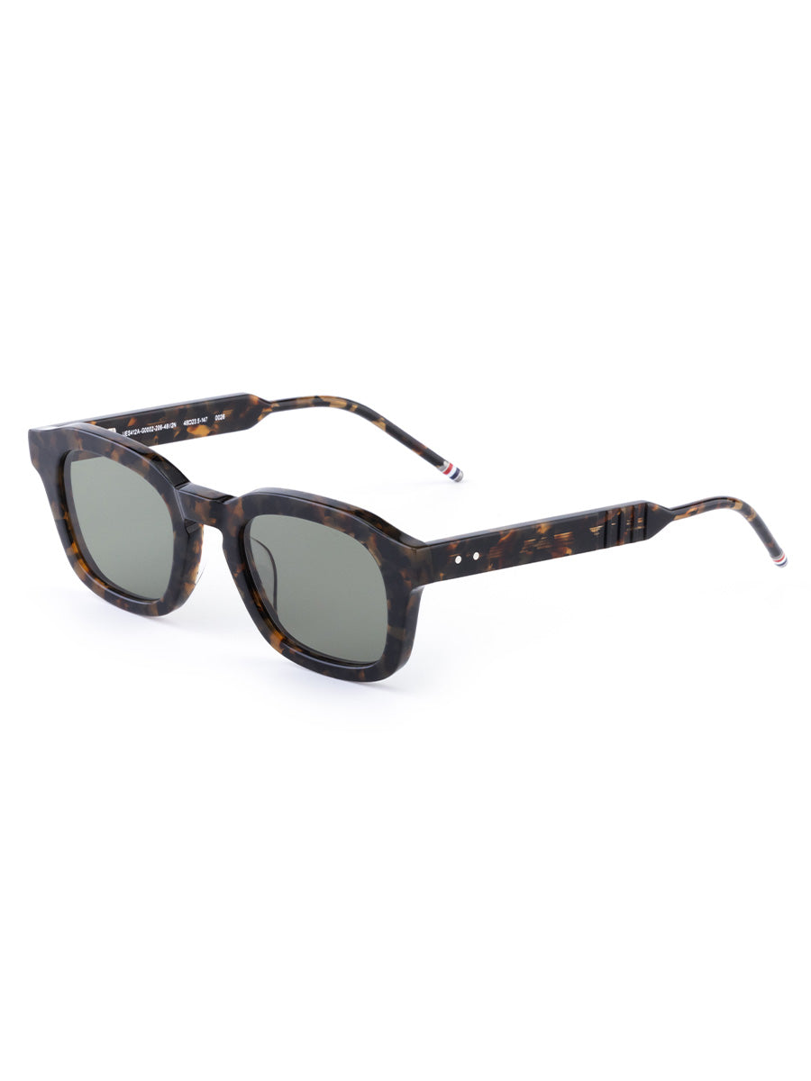 Thom Browne 412A 206 Tokyo Tortoise Rectangular sunglasses handcrafted from acetate, featuring signature 4-bar details and striped enamel temple tips.