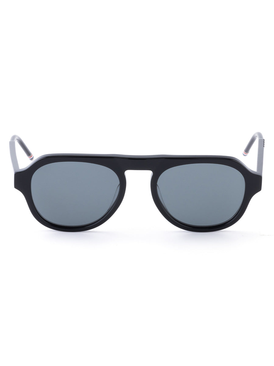 Thom Browne 416A 007 Black Aviator sunglasses featuring aviator frames with signature 4-bar details and striped enamel temple tips.